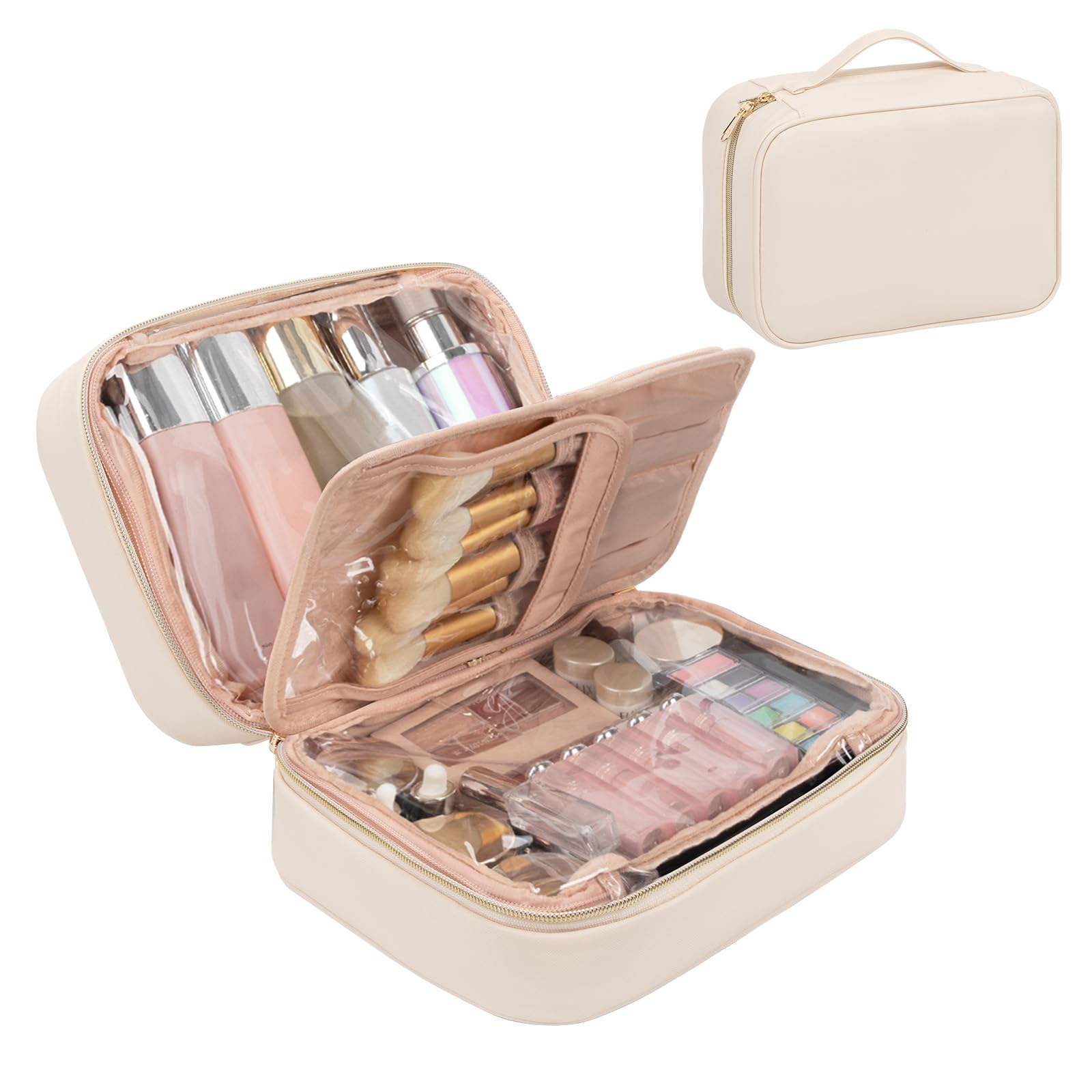 OCHEAL Makeup Bag, Make up Travel Bag Large Capacity Waterproof Cosmetic Organizer Bag with Makeup Brush Compartment & Handle for Women Girls Travel Toiletry Accessories-Beige