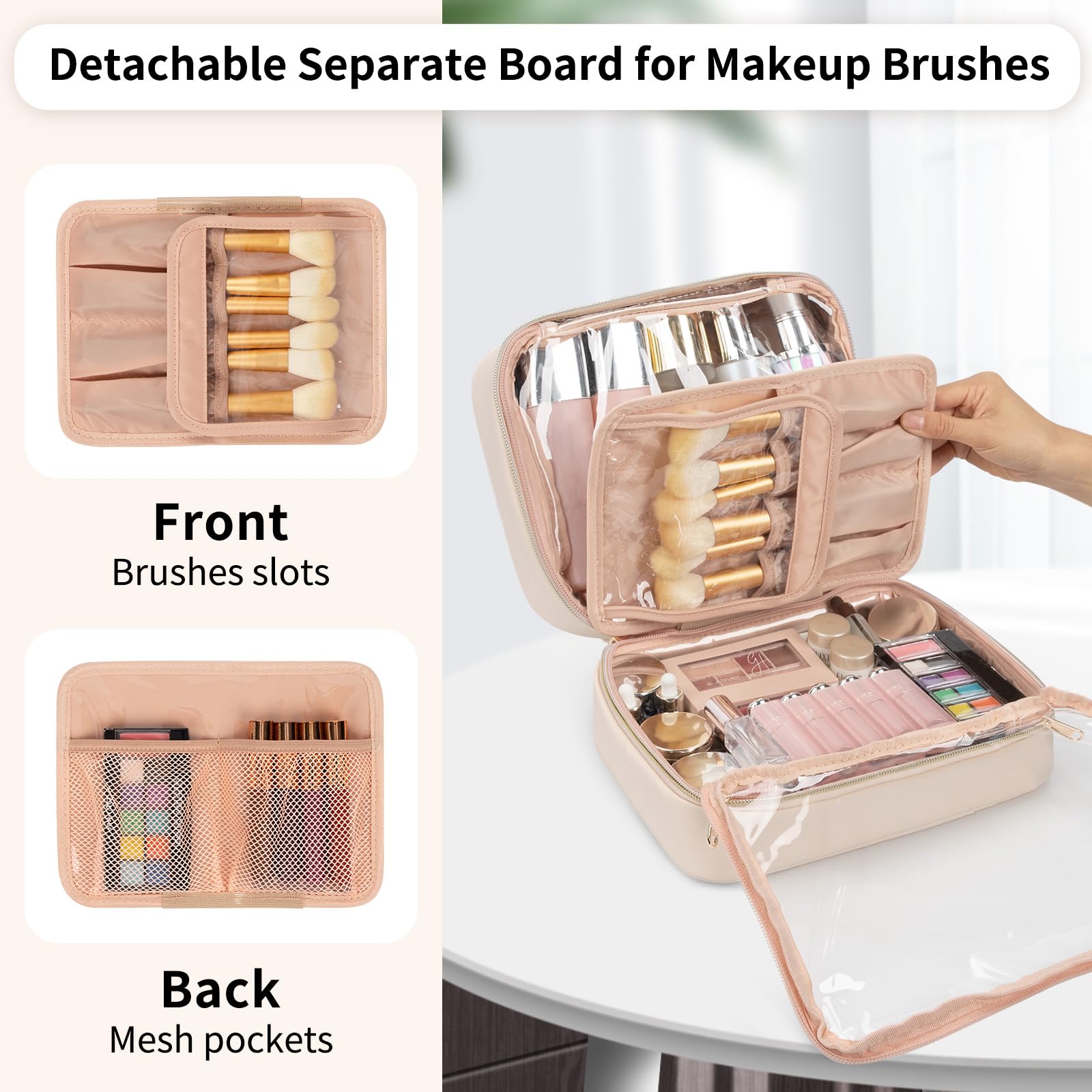 • 【MULTIPLE STORAGE COMPARTMENTS 】 - The makeup bag has two main compartments, a separate board for makeup brushes, has elastic sots and two mesh pockets , and multiple compartments to keep your cosmetics organized. The waterproof lining makeup bag is easy to clean, and you'll never have to worry about your bag or items getting dirty again