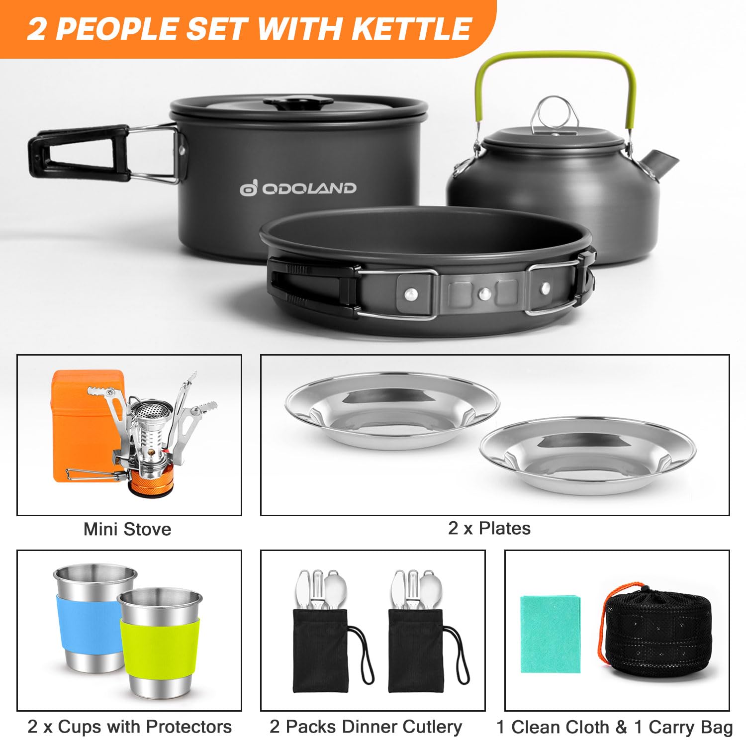 • The Best Money You Ever Spent - The 16pcs camping cookware mess kit 's fully equipped for 1 to 2 people. This lightweight camping pots and pans set is a great choice for hiking, backpacking, camping or any other activity.