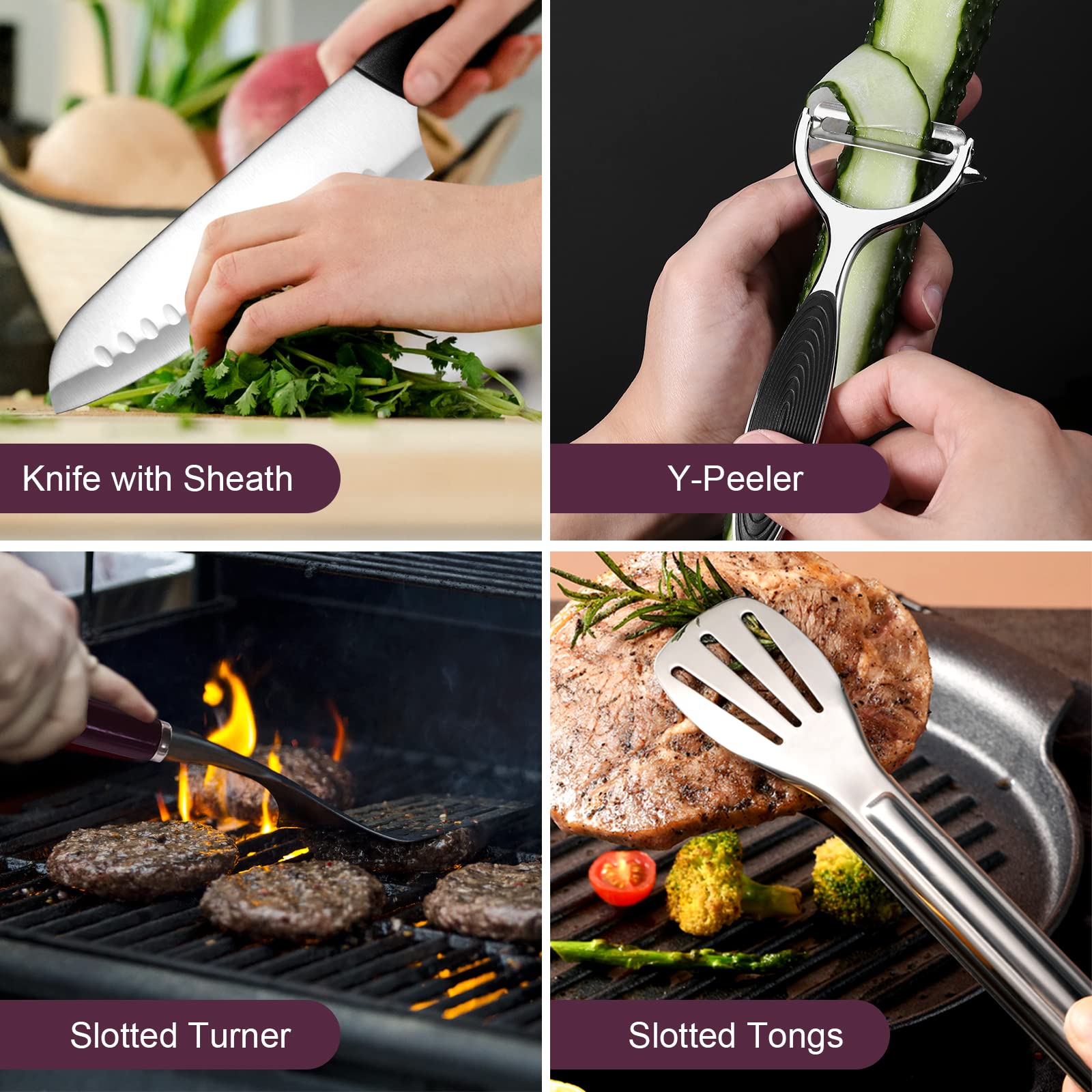 • Camp Kitchen Equipment: 8pcs in 1 package, includes 1 x tongs, 1x spatula, 1x serving spoon, 1x knife, 1x scissors with bottle opener, 1x rice paddle, 1x cutting board and 1 water resistant case. Any of these stuffs has its own place, so units don’t get smeared.