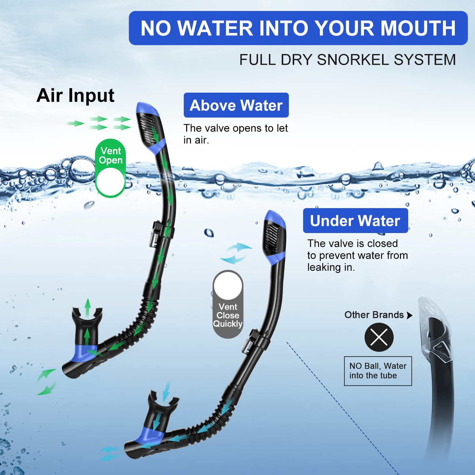 • Anti-Fog & Anti-Leak: The dry snorkel has a closing valve which seals the tube automatically as you dive while it allows air to easily enter snorkel for relaxed and unobstructed breathing when on water surface. It will keep water out when you dive under the water surface.