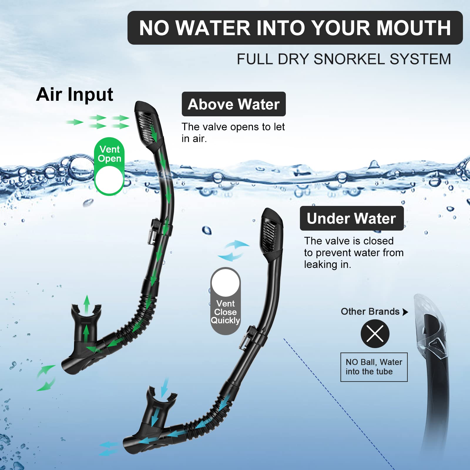 • Anti-Fog & Anti-Leak: The dry snorkel has a closing valve which seals the tube automatically as you dive while it allows air to easily enter snorkel for relaxed and unobstructed breathing when on water surface. It will keep water out when you dive under the water surface.