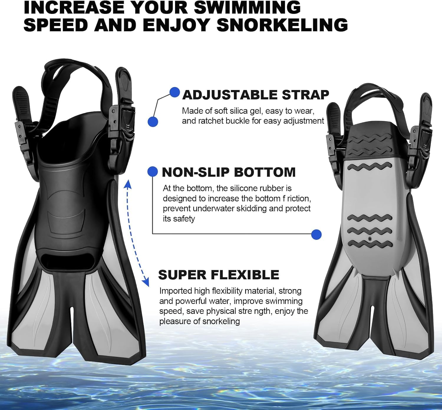 • The Complete Snorkeling Package: Includes 1 full face snorkel mask, 1 pair snorkel fins, 1 mesh bag for carry. Snorkel mask + snorkel fins, ideal set is your complete snorkel gear.