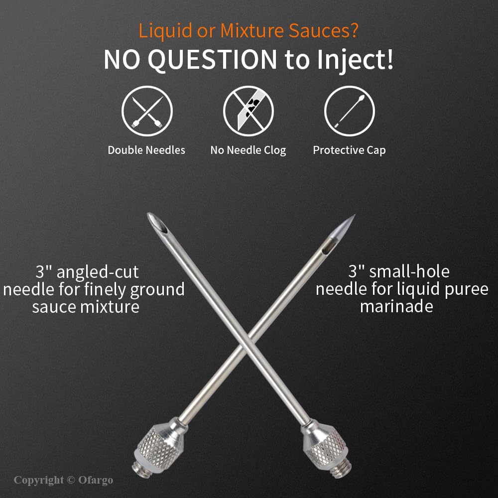 • Easy to single Hand Use & Dishwasher Safe--ergonomically designed for single hand injecting handles; graduated injection chamber: 1-oz/30ml capacity measurement markings in ml and oz up the side; 3” sturdy seasoning injector needle with hole for deep penetration and sauce distribution with liquid brine/marinades; easy clean for meat needle with the small cleaning brush