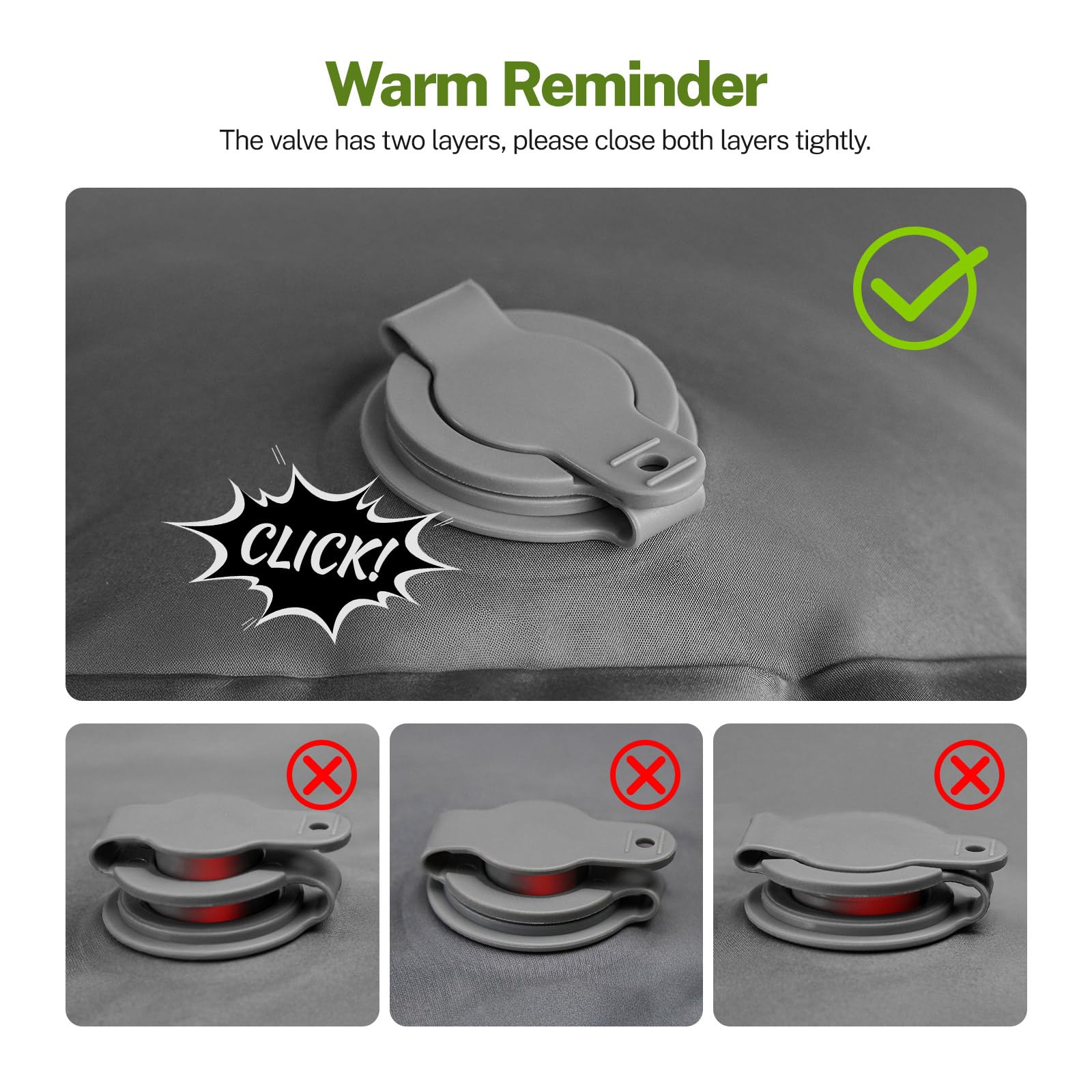 • Easy Inflation with Foot Pump -- Effortlessly inflate the camping pad by stepping on the built-in foot pump. Dual-layer air valves ensure rapid inflation and prevent air leakage, making it ideal camping gear for camping or any outdoor activity.