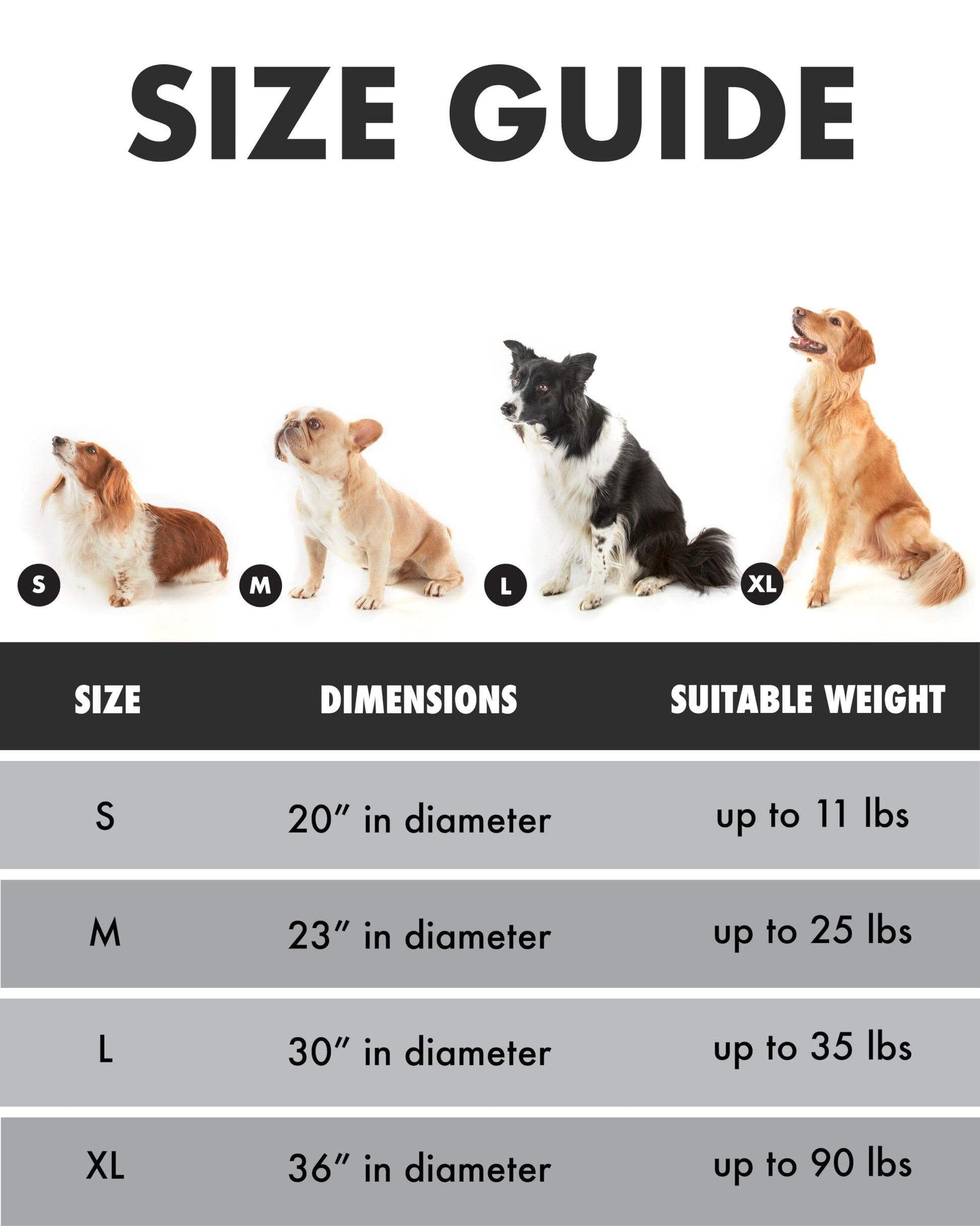 • Find the perfect fit for your furry pal with our four size options: Choose the 20-inch bed for tiny tails under 10 lbs, the 23-inch for those cuddly companions under 20 lbs, the 30-inch for medium buddies under 40 lbs, and the 36-inch for larger friends up to 60 lbs. Don't forget to measure your pet to ensure they get the coziest spot for their naps and relaxing time