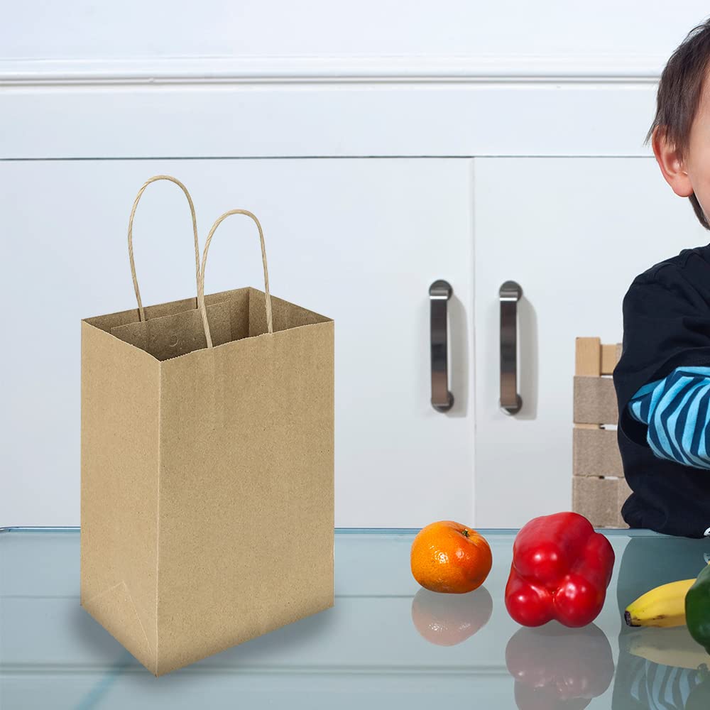 Oikss 100 Pack 5.25x3.25x8.25 Inch Small Plain Natural Kraft Paper Gift Bags with Handles Bulk for Birthday Party Favors Grocery Retail Shopping Business Goody Craft Bags Cub Sacks (Brown 100 Count)