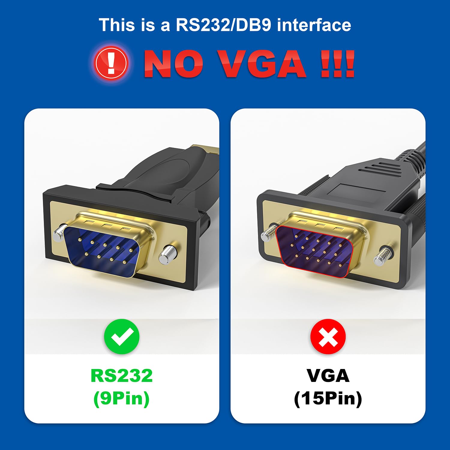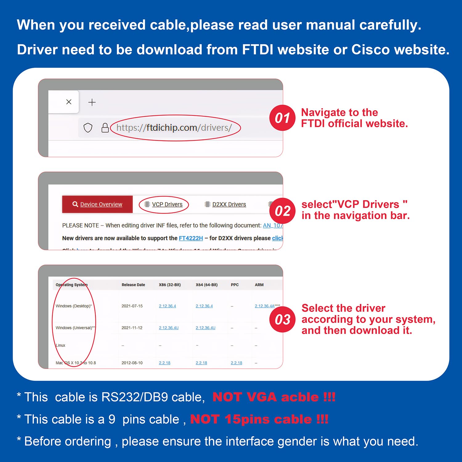• !!Please NOTE: this is MALE RS232 to DB9 SERIAL CABLE ,Not VGA!!!It is 9 pin, NOT 15 pin!! Look carefully of the Pin is match with your device. Before ordering , please confirm the interface gender is waht you need. After receiving ,please read user manual /instruction at first and download the Driver at first from FT232 Official website or Cisco website . Customer service always online.