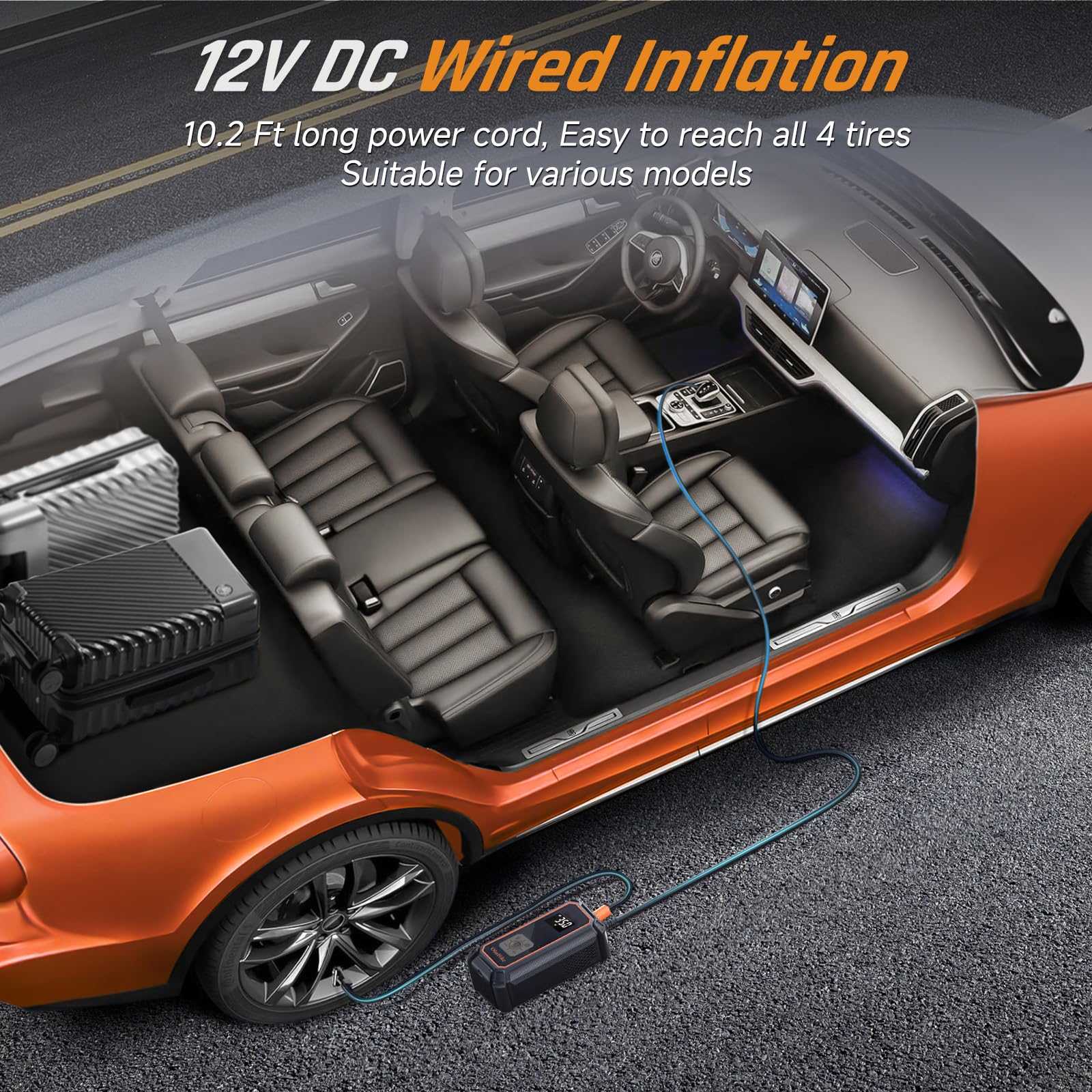• 【Fast and Efficient Inflation】Equipped with a powerful motor that delivers rapid airflow, this inflator can pump up an average car tire sized 195/65 R15 to 29-35psi in just about a minute. Ideal for cars, motorcycles, bicycles, and sports balls, this portable tire inflator enhances convenience for everyday life and travel