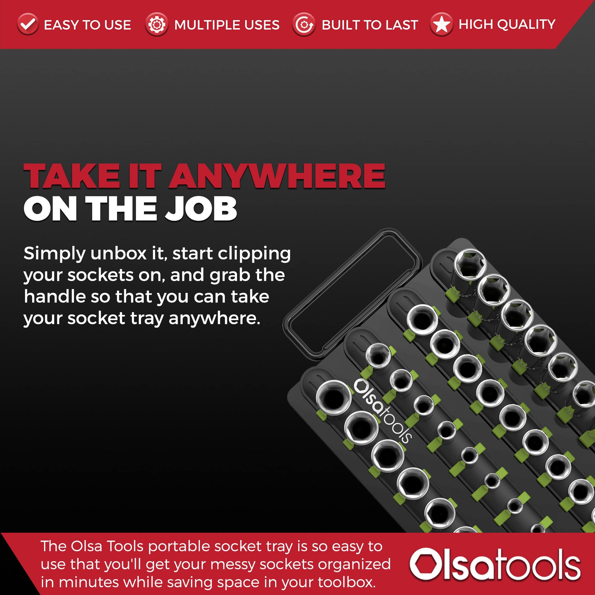 • EASY PORTABILITY & CONVENIENCE - The Olsa Tools portable socket tray is so easy to use that you'll get your messy sockets organized in minutes while saving space in your toolbox. Simply unbox it, start clipping your sockets on, and grab the handle so that you can take your socket tray anywhere.