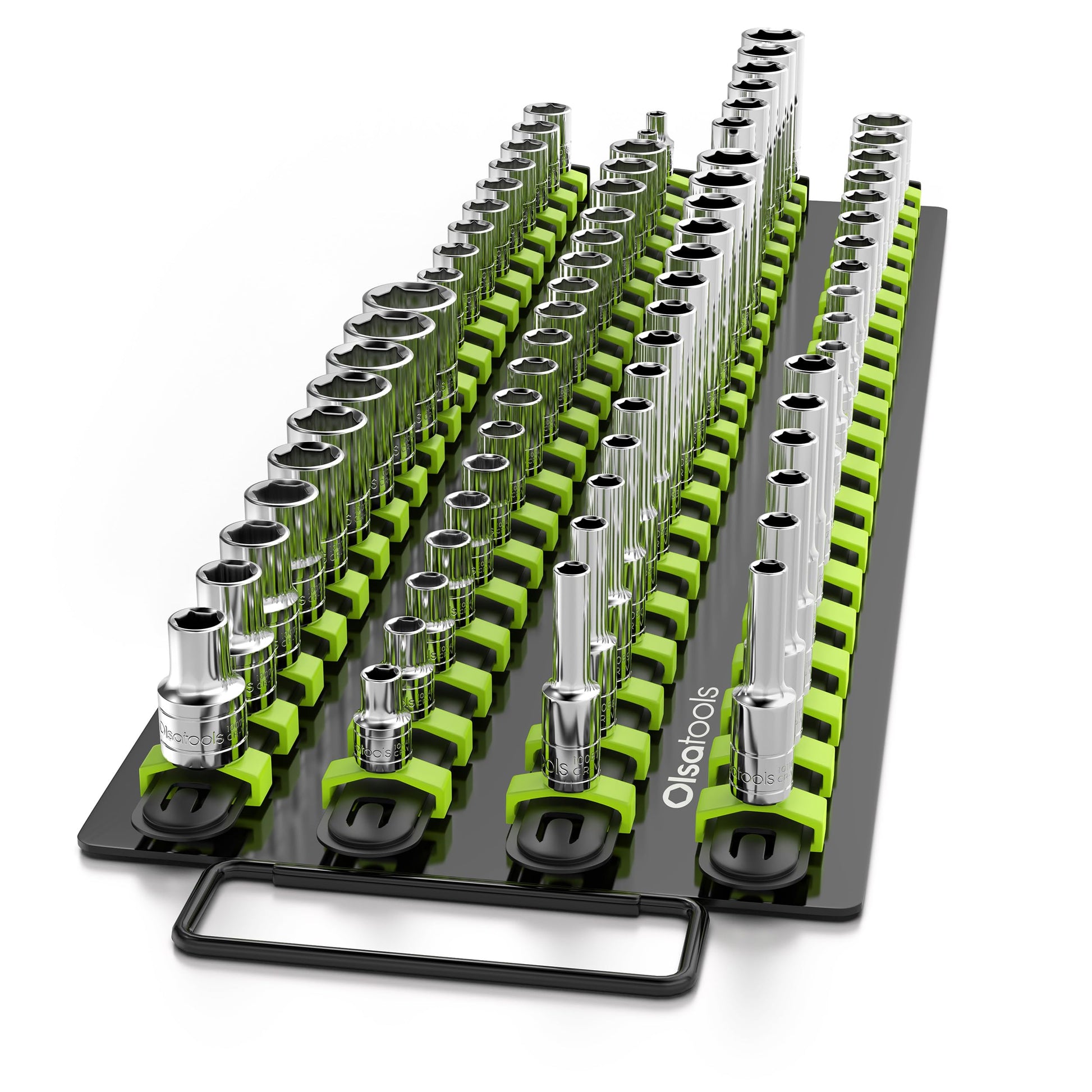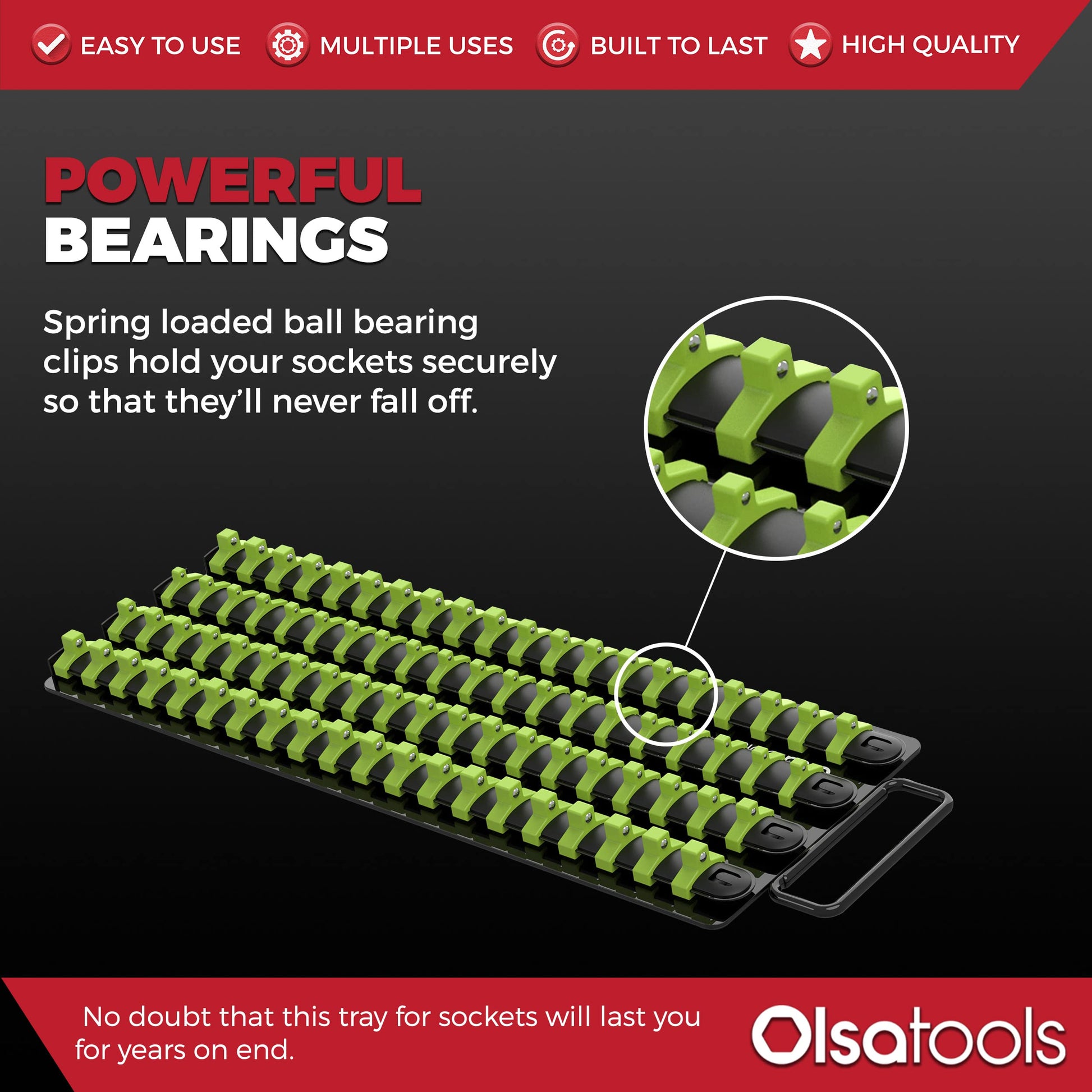 Olsa Tools Portable Socket Organizer Tray | Black Rails with Green Clips | Holds 80 Sockets | Professional Quality Socket Holder