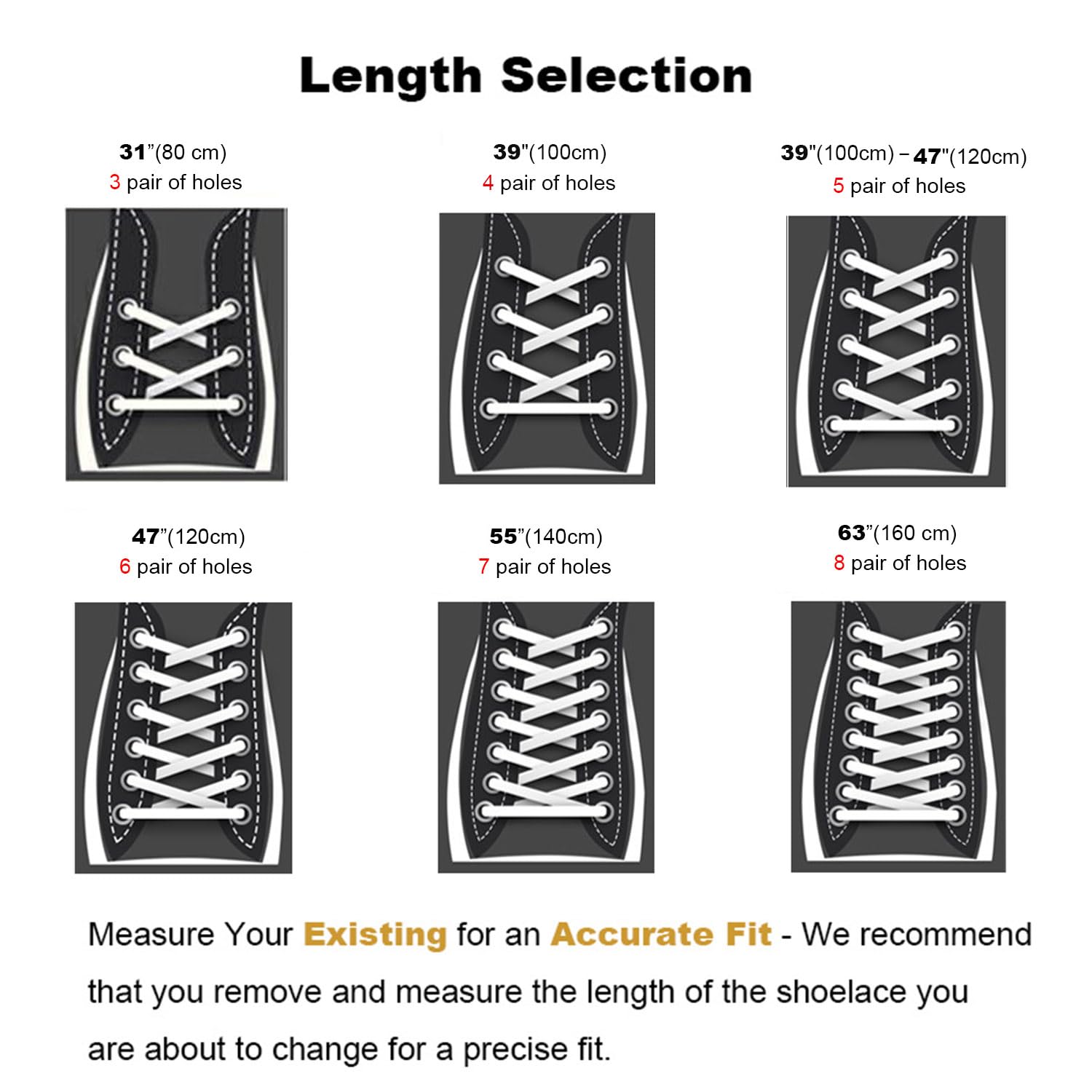 • Multiple Colors and Sizes: We provide 15 color of 5 size to chose: 31"(80cm), 39"(100cm), 47"(120cm), 55"(140cm), 63"(160cm); Measure the length of your current shoe laces in inch or cm so you will get the length for the new shoe strings