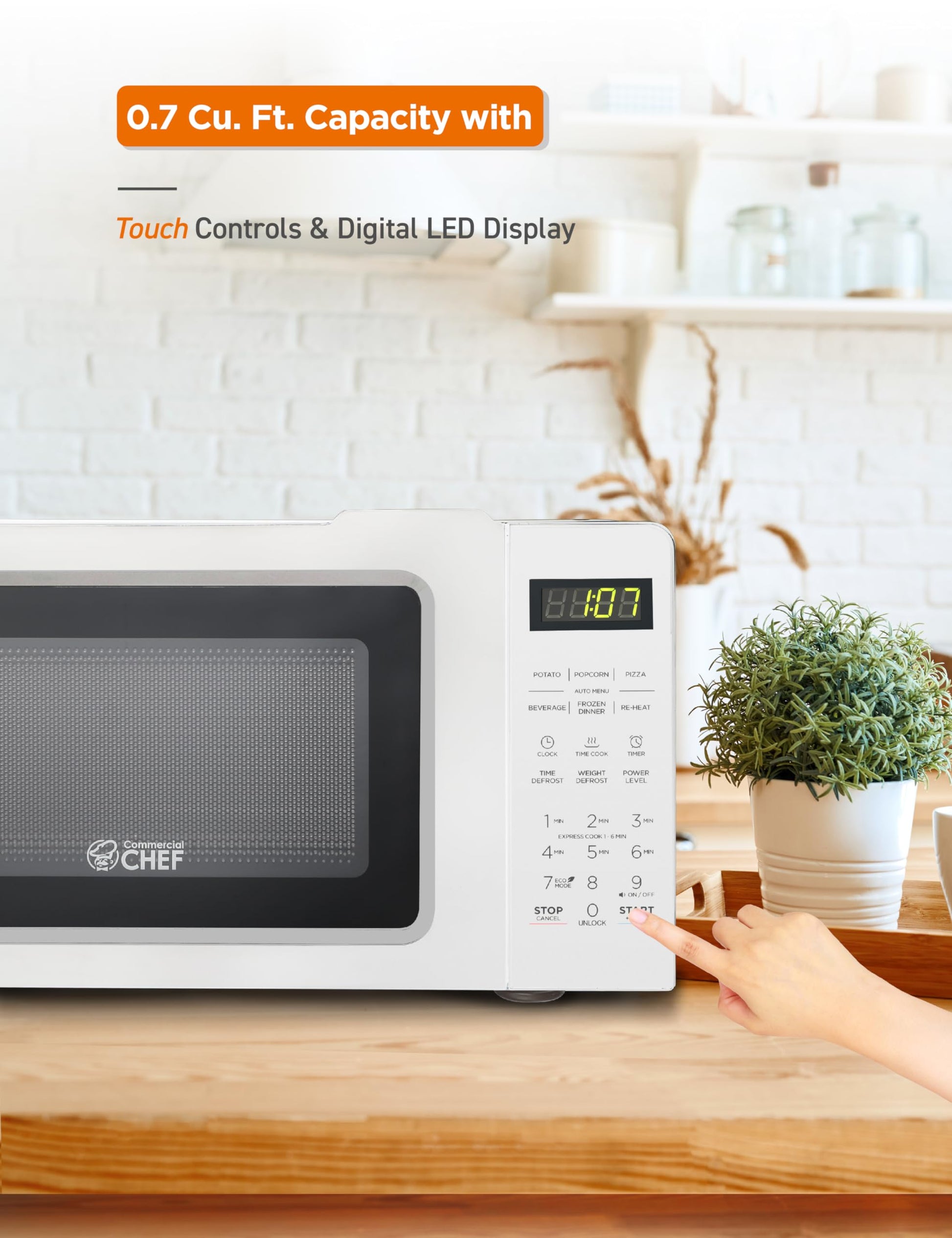 OMMERCIAL CHEF 0.7 Cubic Foot Microwave with 10 Power Levels, Small Microwave with Pull Handle, 700W Countertop up to 99 Minute Timer and Digital Display, White