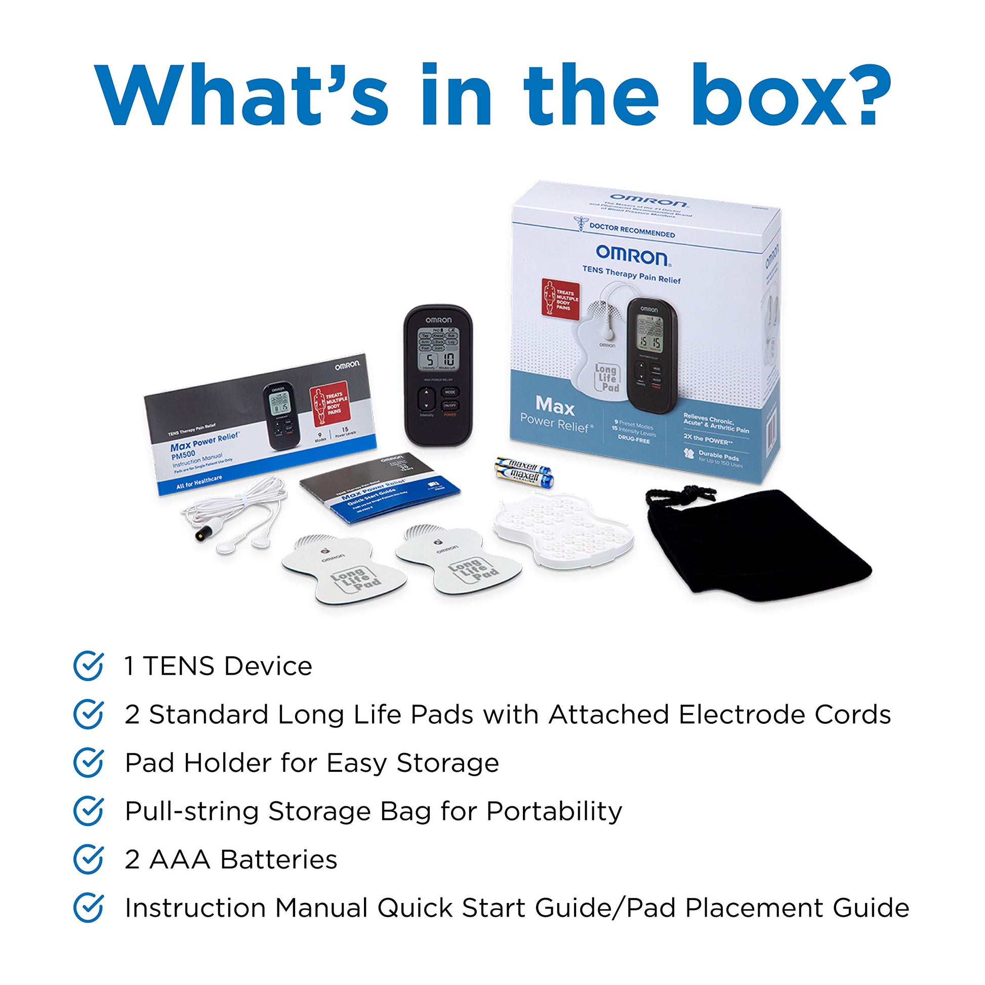 Details: The OMRON Max Power Relief TENS Unit is one of our most powerful and versatile muscle stimulators, designed to help relieve chronic, acute, and arthritis pain. Offering twice the power of our Pocket Pain Pro, it's ideal for tackling deep, hard-to-reach pain that keeps coming back—especially in areas like the lower back, knees, and shoulders. This portable device fits comfortably in your hand or pocket, making it easy to use at home, at work, or on the go. Max Power Relief features six body pain modes (shoulder, lower back, arm, foot, leg, joint) and three massage-like modes (rub, tap, knead), each with 15 adjustable intensity levels, allowing you to personalize your therapy to your exact needs. Whether you're dealing with pain from daily activities or muscle soreness from exercise, this TENS unit delivers targeted, drug-free relief. The unit comes with a pair of comfortable, self-adhesive Long Life Pads that are reusable up to 150 times, along with a convenient plastic holder for storage. With its strength, flexibility, and portability, Max Power Relief is a smart choice for anyone looking to take control of their pain management. NOTE: To avoid damage to the device, use only with the leads, electrodes, and accessories recommended by OMRON.