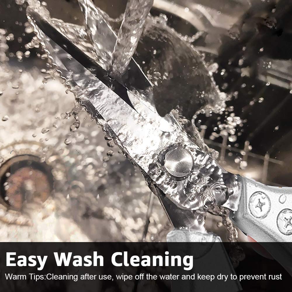 • ✄【Easy to Clean】- Meat scissors are easy to clean and maintain. They can be washed by hand with soap and water, or placed in the dishwasher for a thorough cleaning. Tip: After cleaning the cooking scissors, please dry the water stains to keep the scissors in a dry state, so that the stainless steel kitchen scissors can get a longer service life.