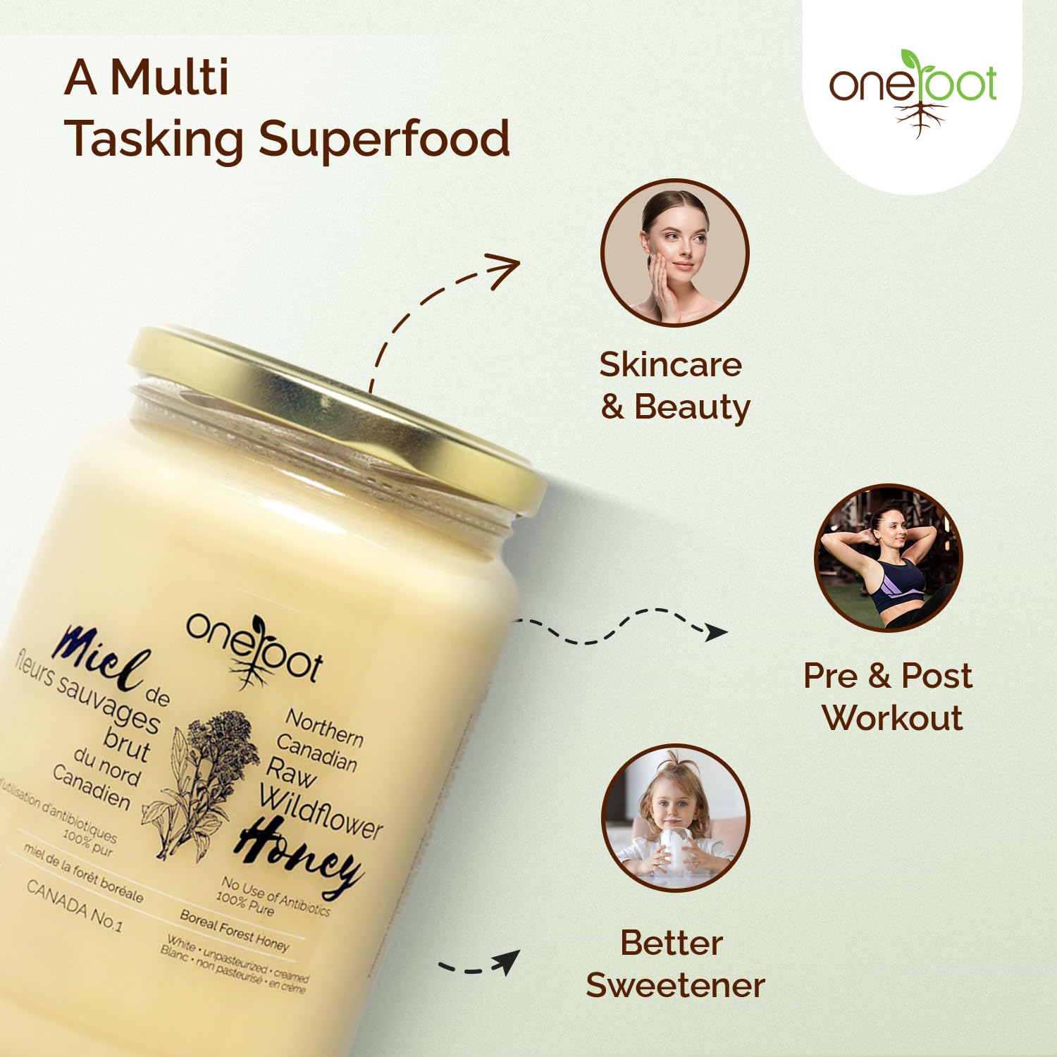 Oneroot 100% Canadian Flower Honey - 1kg / 2.2lbs, Honey Wildflower Unfiltered, Unheated & Creamed, Nutrient Rich Raw Wildflower With Enzymes, Thick Natural Sweetener