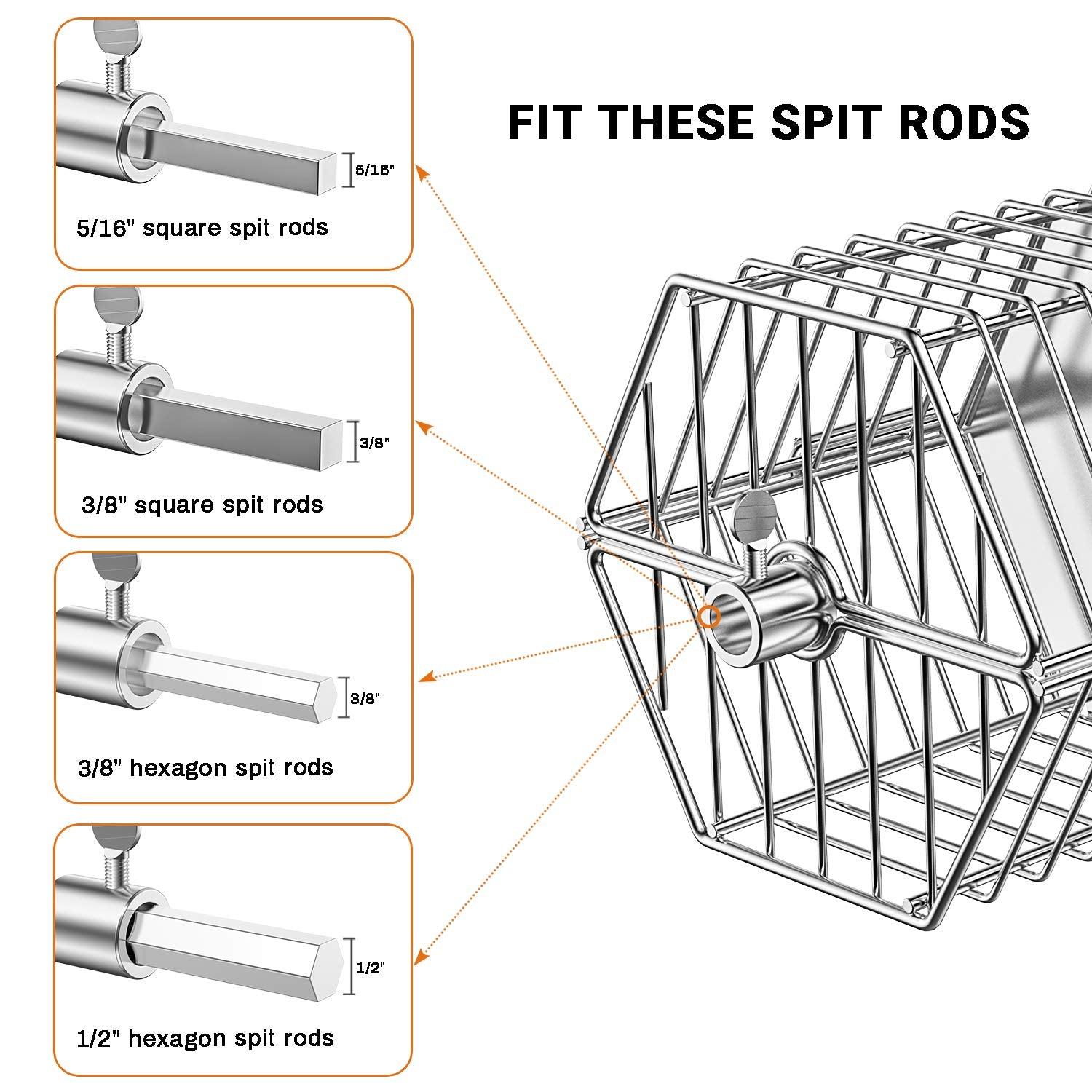 • Fits for 1/2" Hexagon, 3/8" Hexagon, 3/8" Square & 5/16" Square Spit Rods, can be used on most common grills: gas grills, charcoal grill, or larger kamado grills.