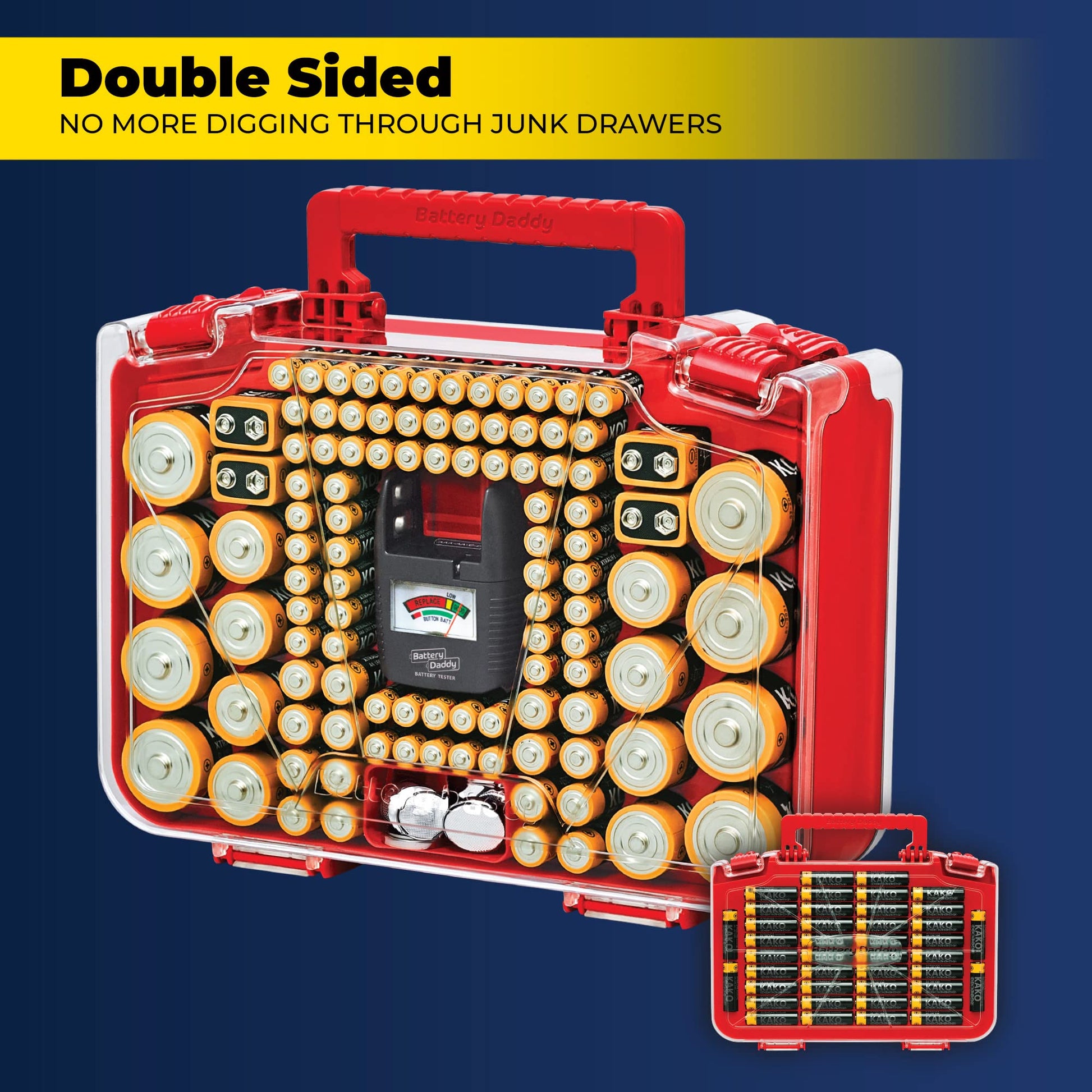 • Sleek and Compact Design: Battery Daddy uses both sides to store up to 150 batteries of all types. Holds 58 AAs, 68 AAAs, (4) 9 Volt, 8 Cs, 8 Ds, & 8 Button Cells. Easily stores away in any drawer. Includes Battery Tester