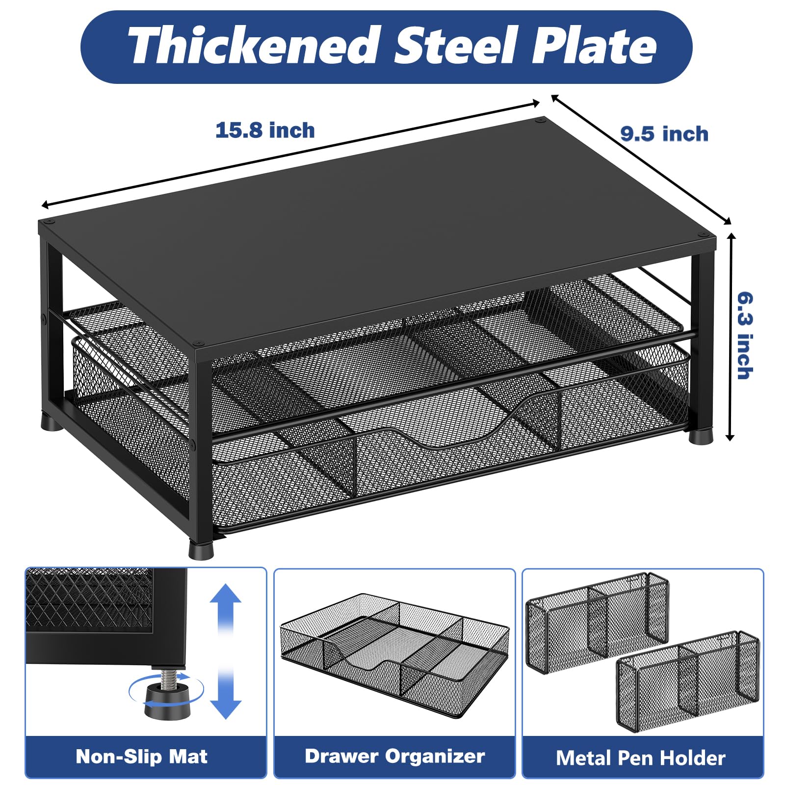 • 【Save Space】:This 2-Tier monitor stand with drawer and 2 hanging pen holders provides ample storage space to keep your office supplies and office desk accessories neatly organized and easily accessible, keeping your workspace tidy and improving your sense of well-being