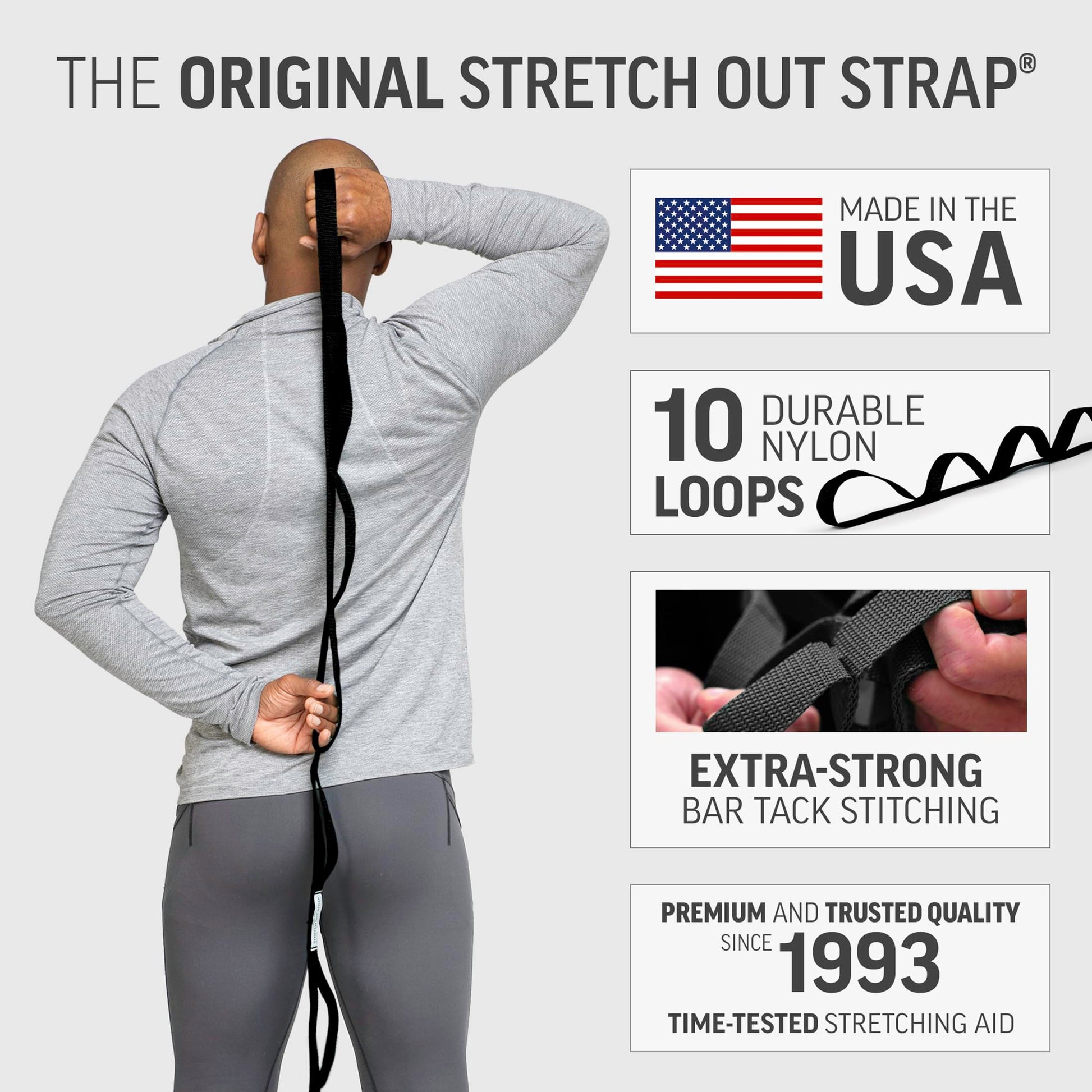 • Top Choice of Physical Therapists: The Original Stretch Out Strap, made in the USA, with instructional poster displaying 22 fitness and sports-related exercises and mobile app featuring video demonstrations. The first stretching strap on the market in 1993, still recommended by professionals today.