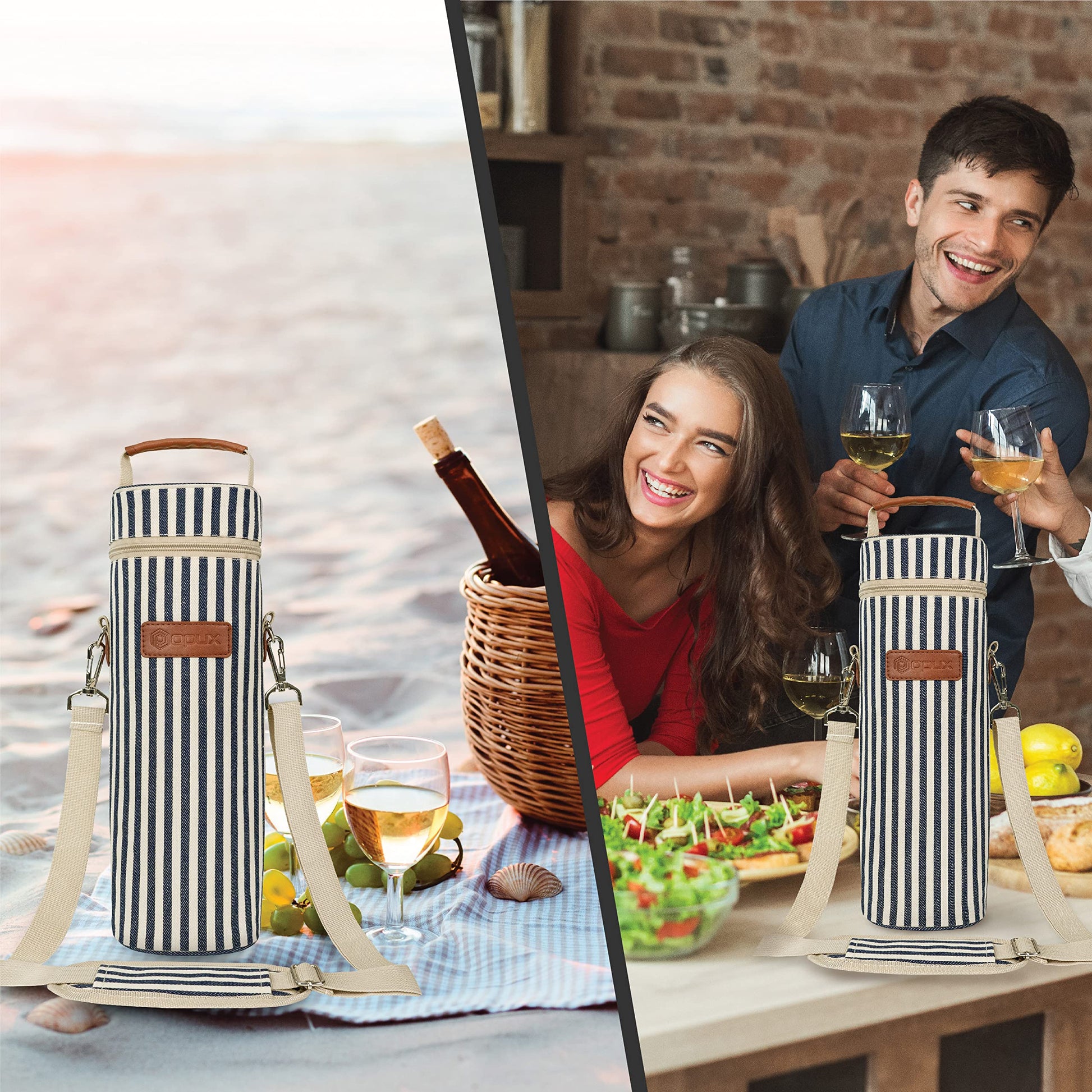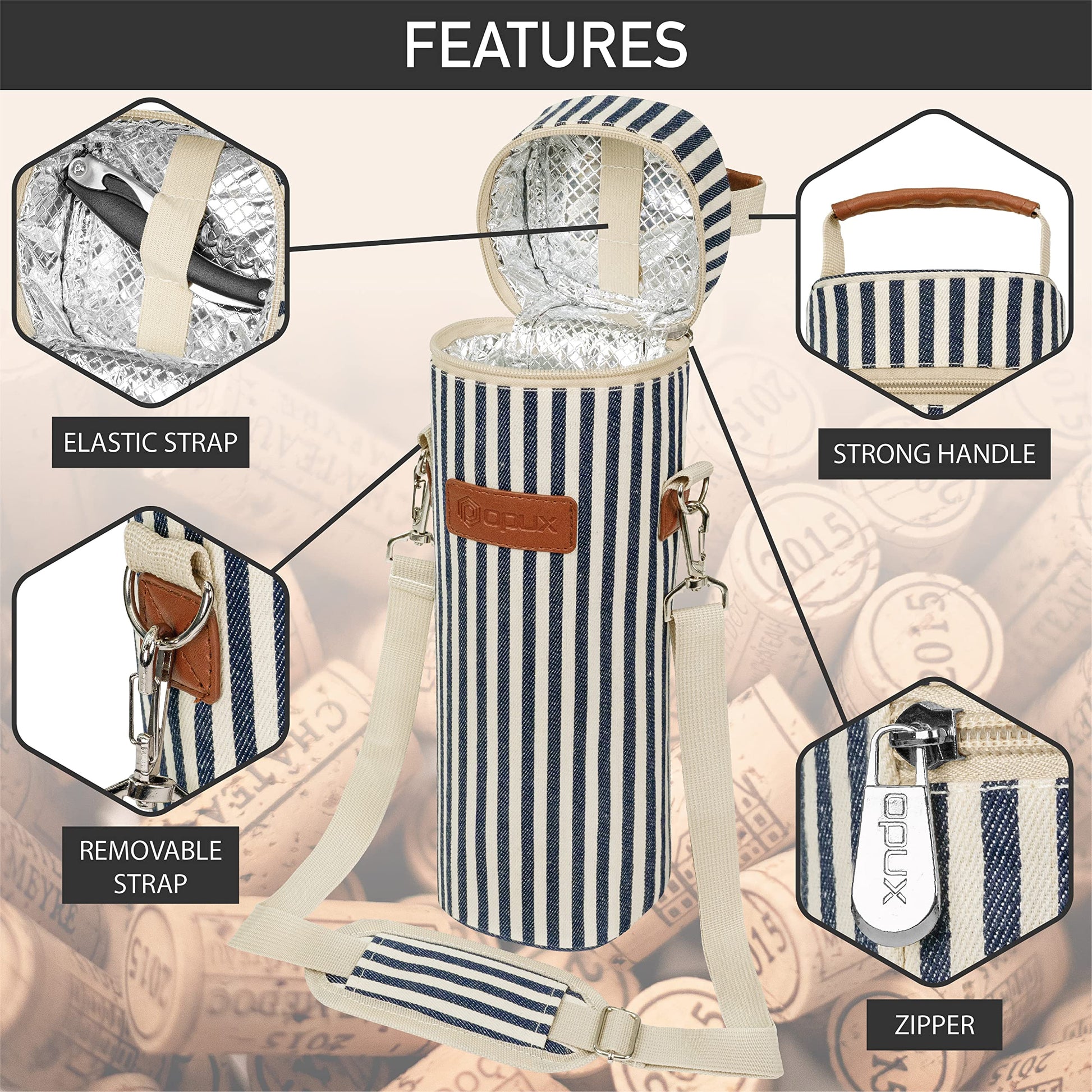 opux Wine Bag Single Bottle Carrier Tote, Insulated Wine Cooler Bag for Travel Picnic Beach with Shoulder Strap, Thermal One Bottle Holder Carrying Case Gift for Women Men, Navy White Stripes
