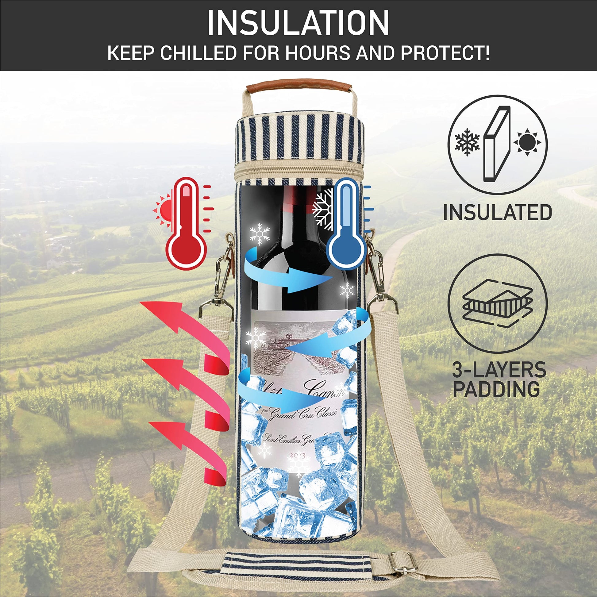• WINE BAG CARRIER 1 BOTTLE: Single bottle wine tote with shoulder strap and zipper is the perfect wine bag for travel, picnic, take to the beach, transport wine, camping, outdoor concerts, restaurant, BYOB, dinner, BBQs, gatherings, or party. Reusable portable one bottle wine holder is insulated and is an essential accessory for traveling, wine gift basket for women, men, and wine lovers, drinker. Celebrate special occasions or getaways with your loved ones with a chilled bottle of wine!