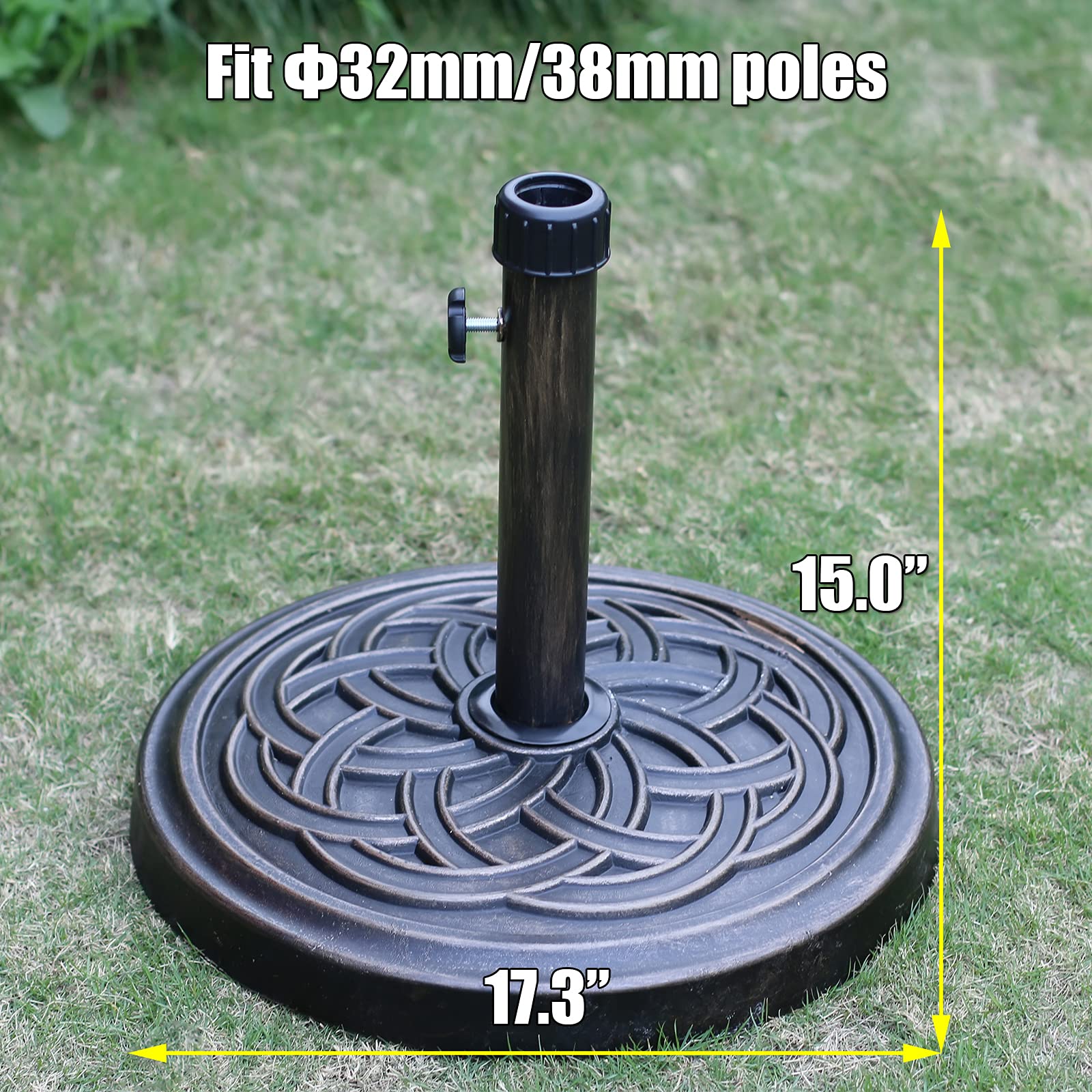 • MATERIAL: This patio umbrella base is made of resin with bronze finish, which enables excellent performance in high durability. Water-resistant and wear-resistant. It will not corrode or deform due to sun exposure and freezing.