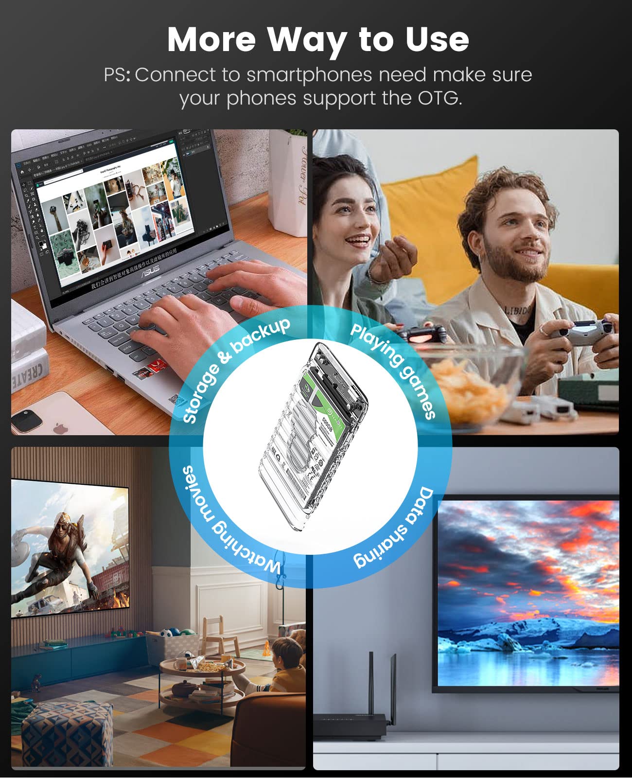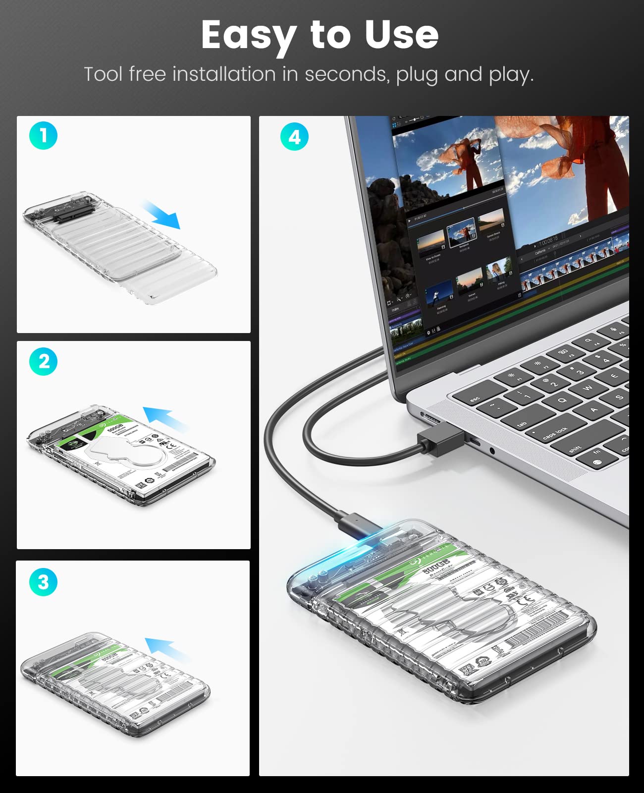 • 【Portable 2.5 SSD/HDD Enclosure】 - ORICO external hard drive case can easily hook up your old 2.5inch SATA I/II/III hard drive to transfer files from one PC to another PC, laptop, PS4 or as a USB external hard drive. A 50cm USB-A cable is included for flexible connection and portability.