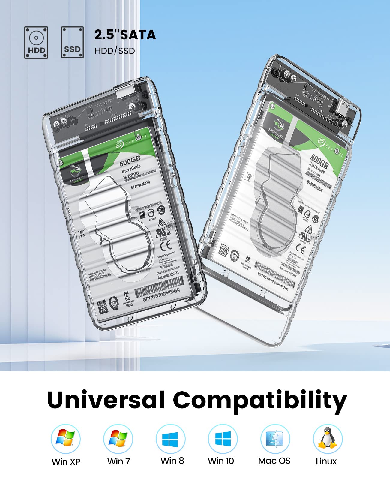 • 【Wide Compatibility】 - This ORICO SATA hdd enclosure helps to connect your 2.5inch SATA I/II/III hard drive SSD to PC, Laptop, TV and PS4. The hard drive enclosure is suitable for 2.5 inch 7mm/9.5mm 6TB solid hard drives, and is compatible with Windows, LINUX and Mac OS and above systems.