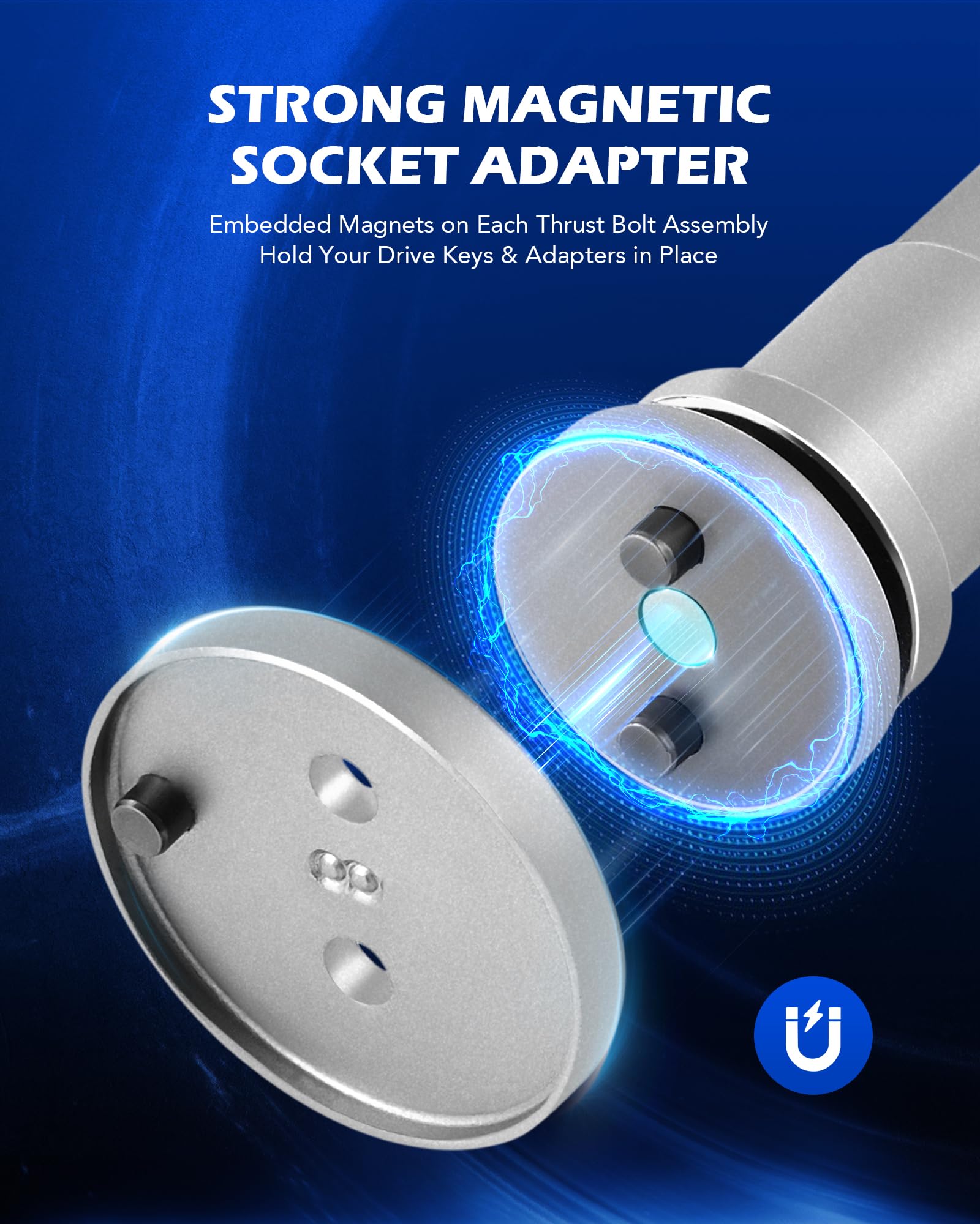 • Hassle-Free Use: Simply rotate the pistons back into their calipers to clear the pads. Embedded magnets in each thrust bolt assembly securely hold drive keys and adapters, while the right and left handed designs ensure versatile operation