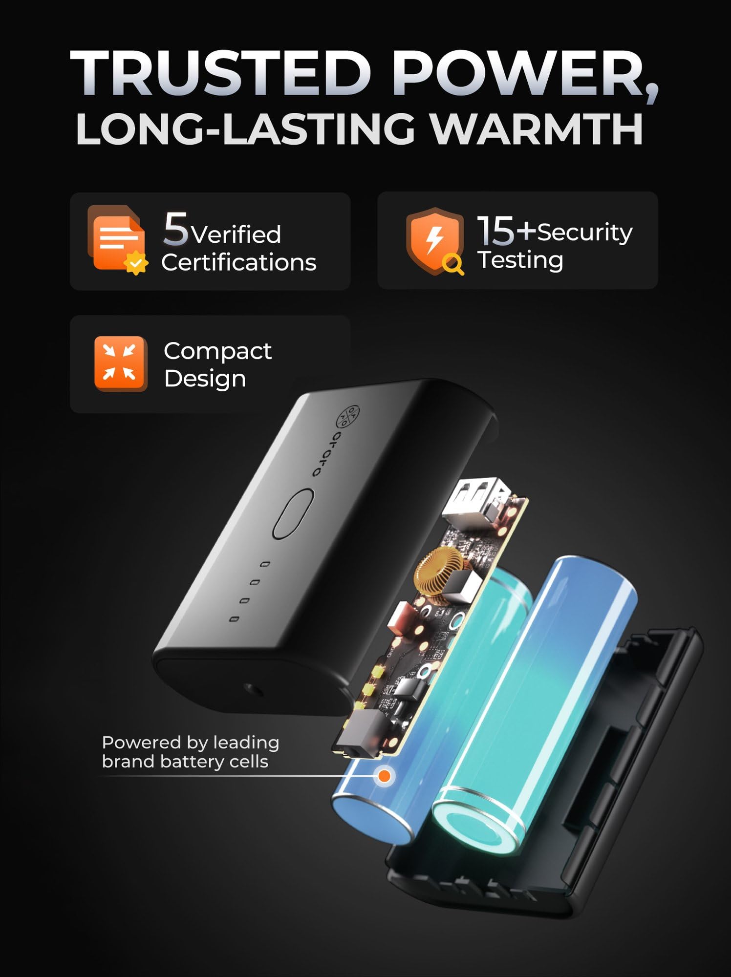 • QUICK AND LONG-LASTING WARMTH: Fast heating in seconds with 7.4V UL/CE-certified battery; Up to 10 working hours on a single charge; USB port for charging smartphones.
