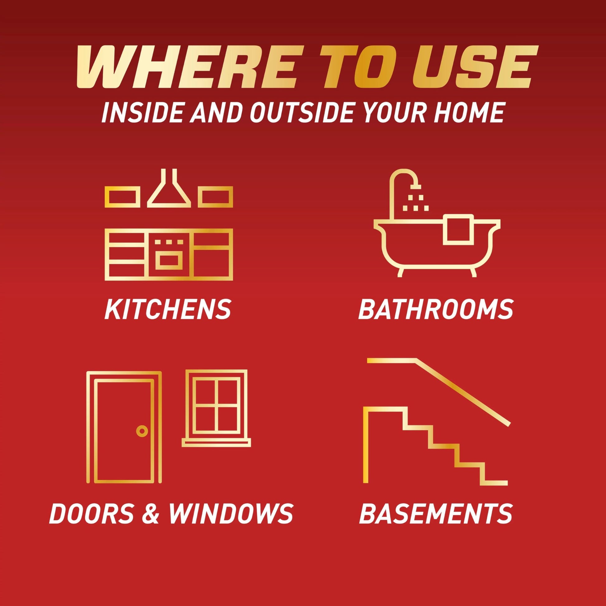 Use indoors in kitchens, bathrooms, doors, windows and basements, and outdoors around the perimeter of foundations, patios, decks, garages