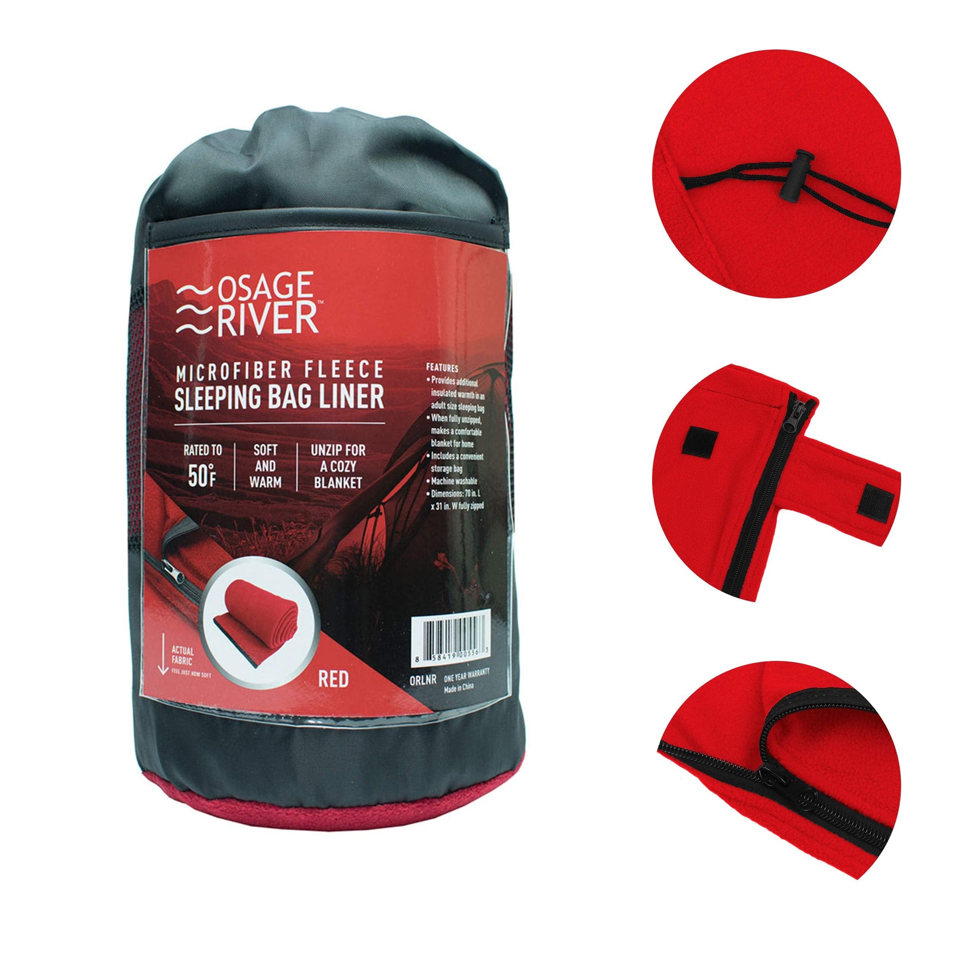 OSAGE RIVER Sleeping Bag Liner, Microfiber Fleece Travel Sheet Sleep Sack for Camping Travel Backpacking, Lightweight Zippered Sleeping Bag Inner Liner, Adults & Kids, Red
