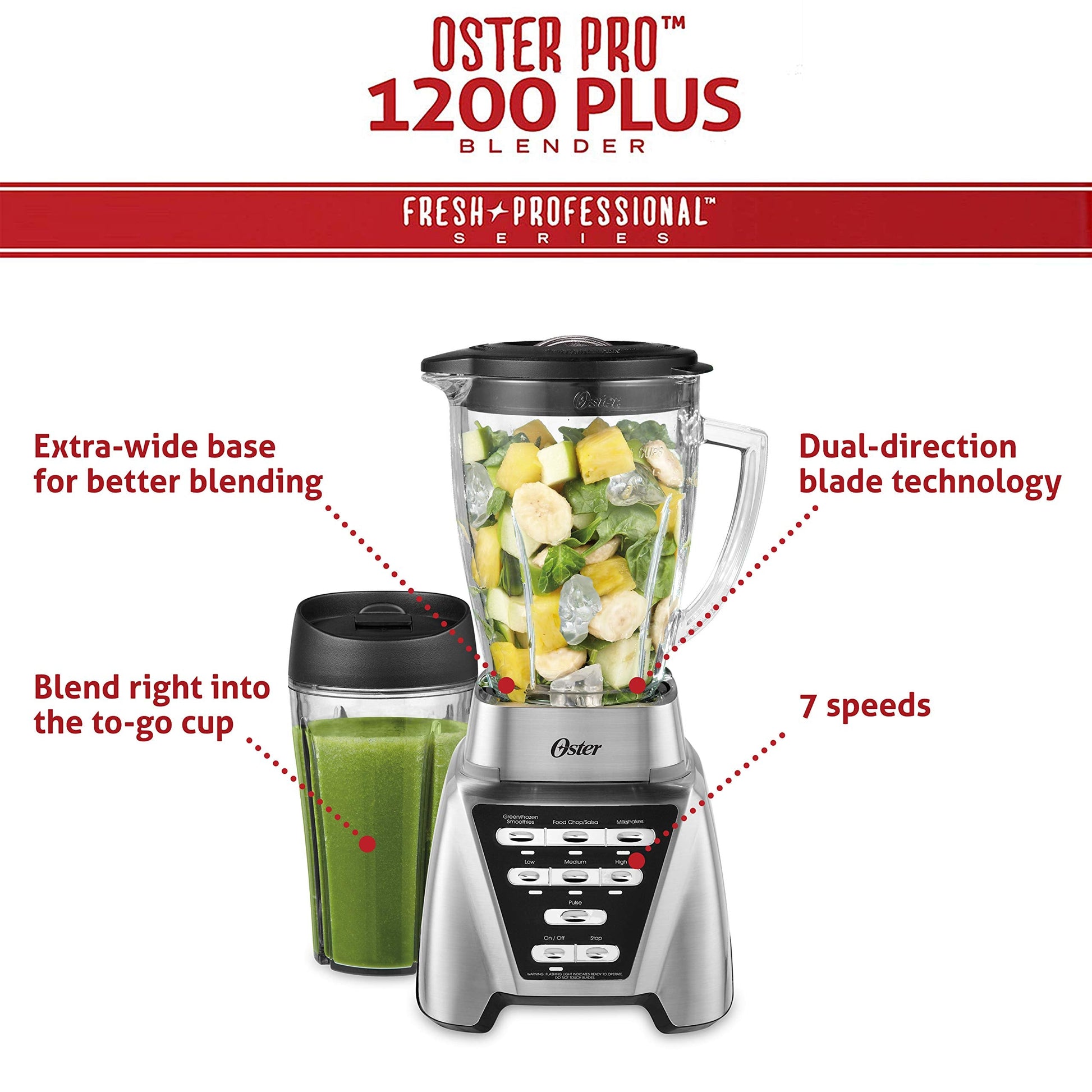 Details: Blending just got better with the Oster Pro 1200 Plus. You can make everything fresh and delicious with this blender's versatility and performance. The powerful motor impresses any chef as it blends through ice, greens, frozen ingredients and more. Starting up with an extra boost at 1200 power watts, it works with blending force to smoothly and continuously create the consistency you need. Smart settings are conveniently programmed to blend the perfect smoothies, salsas and milkshakes in just one touch so you never have to guess how long or what speed to blend your ingredients. The wide base allows foods to flow freely down to the blade and dual direction technology spins the Crush Pro 6 Blade in forward and reverse motion, optimizing the blade's power to blend all types of foods. Better blending tip: Cut up fresh fruit ingredients and freeze in individual portions, then just grab out of the freezer and blend up a smoothie in no time.