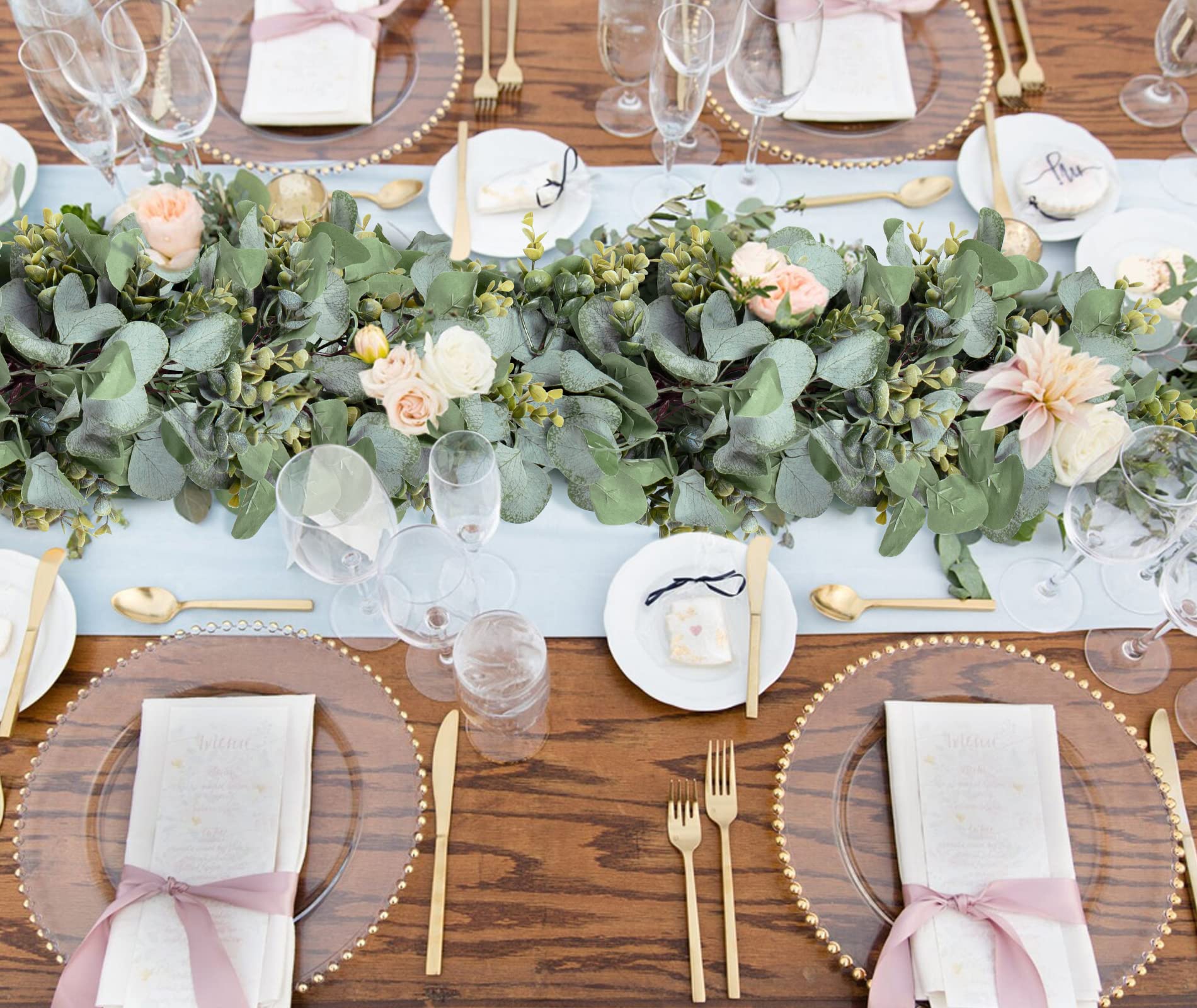 • Amazing 2 Types Mixed Garland - 6.56 ft long faux plastic eucalyptus leaves greenery garland artificial silk silver dollar eucalyptus garland in grey green blended. It has rich leaves and a variety of dark green, light green, grayish green and matte leaves and provides lifelike texture and tons of volume. Each eucalyptus garland is printed with veins to make it vivid. They won't wilt or fade and are easy (and light weight) for destination weddings!