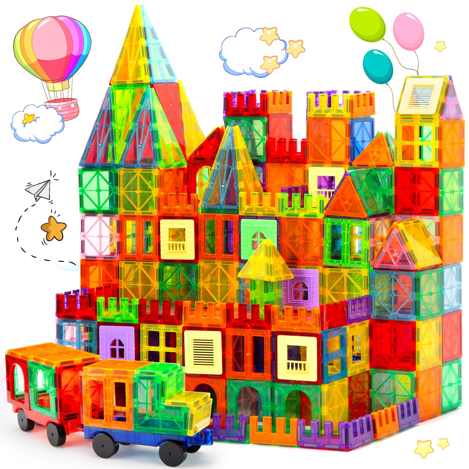 • 【104PCS Magnetic Tiles】This 104pcs magnetic stacking set toy is designed for kids aged 3+,Children can create different 2D planar shapes or 3D geometry and feel a sense of accomplishment,This magnet toy set also comes with 2 car bases,which can help children to develop their fine motor skill ,imagination and creativity