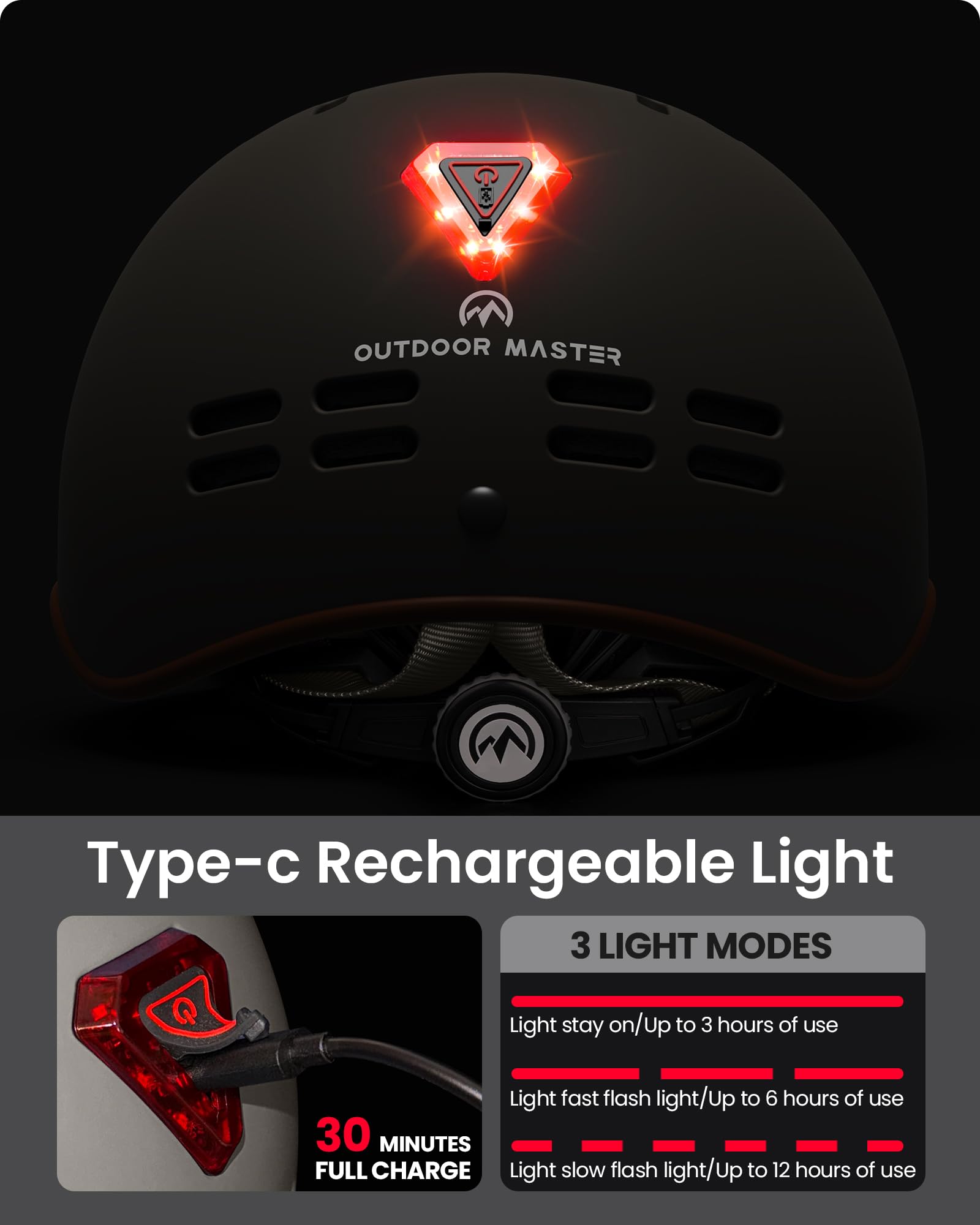 • Multi Occasions: This Retro Urban leisure style adult bicycle helmet with light is perfect for a variety of outdoor activities, including commuting, skateboarding, skating, scooter, longboard, and road-biking. The OutdoorMaster helmet's classic design will complement any ride