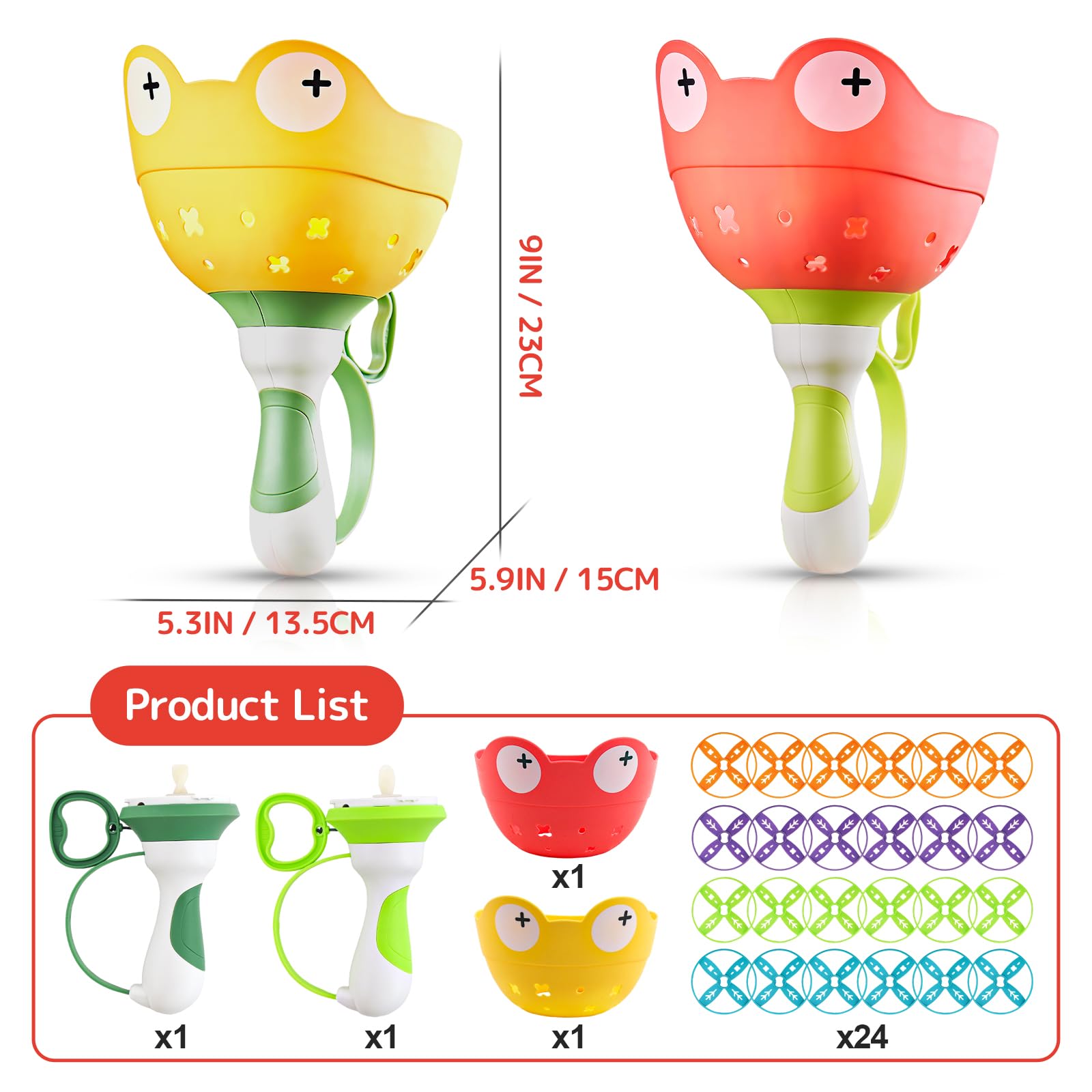• Games for Kids Ages 4-8: Outdoor games with 24 discs and 2 Frog Hand Launch Catcher. Easy to play. Children just need to pull the launchers pull ring and the frog's head will launch flying disc, which children need to catch with launchers, and children will have fun trying to chasing them. The one who catches the most discs wins