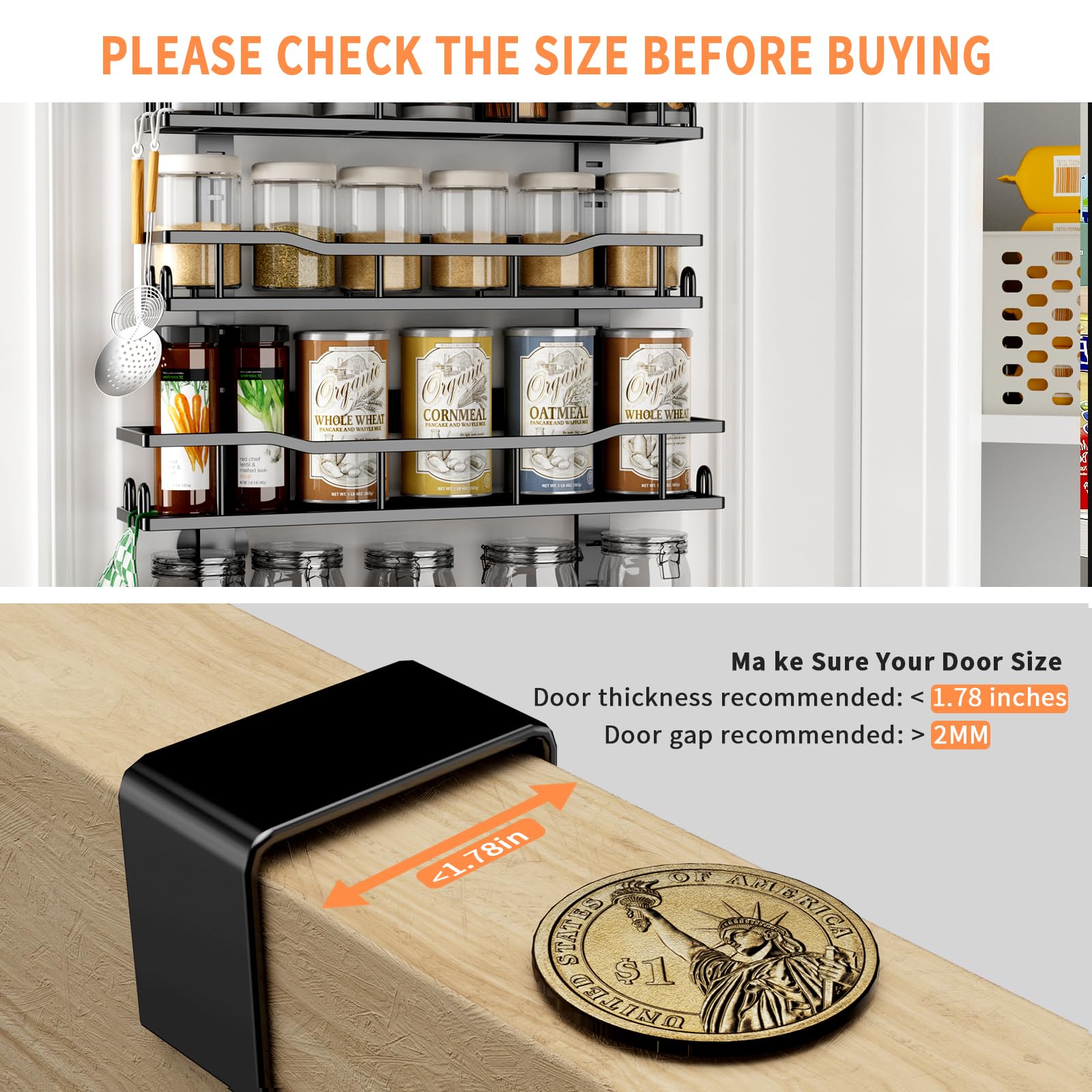 • 【Hassle-Free Installation】This over door spice rack is designed to fit most doors, doors should not be thicker than 1.78 inches. You can easily finish the installation of the spice rack in just 5-10 minutes. No complicated tools or drilling required, which make it a hassle-free storage solution that won't damage your walls or doors.