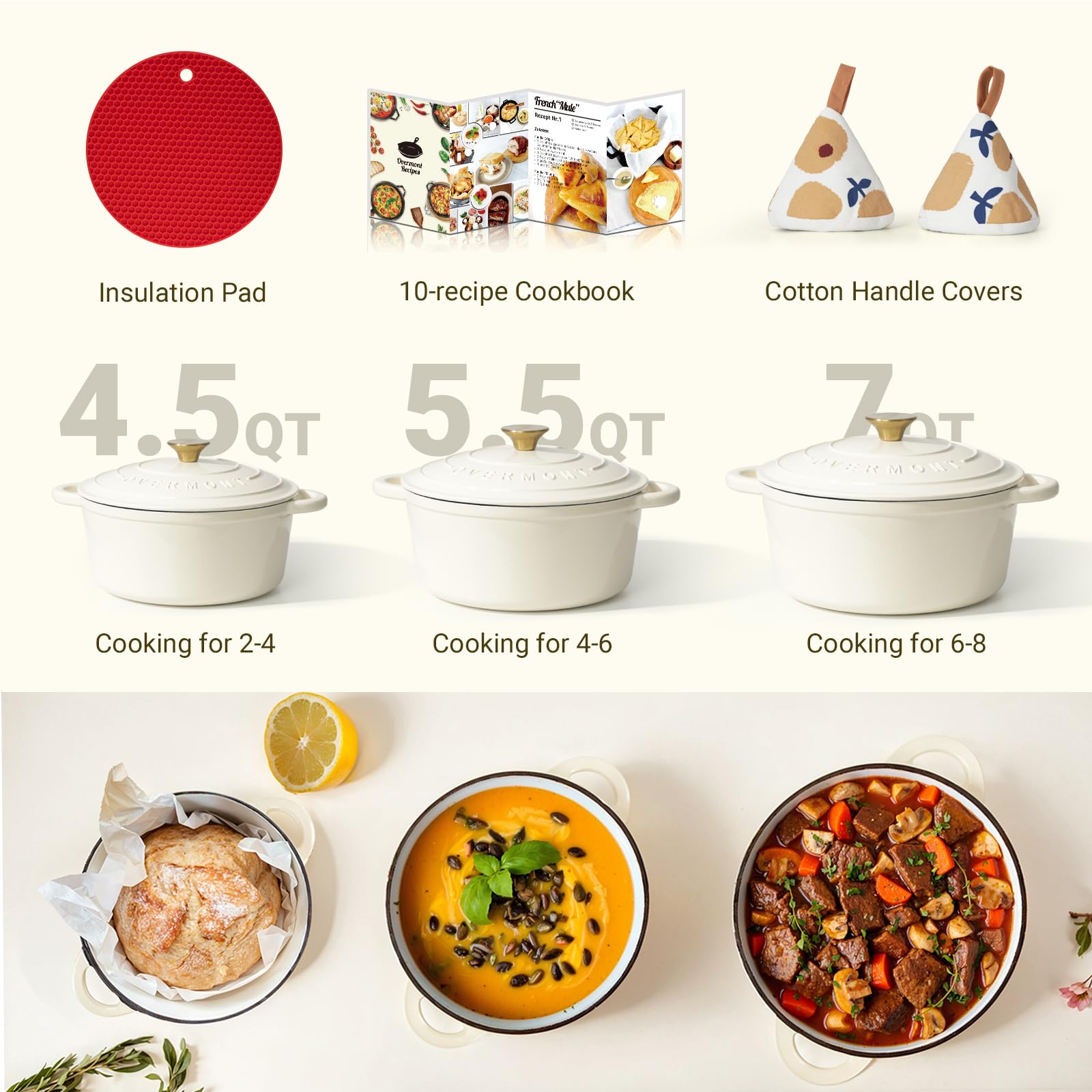 Overmont Enameled Cast Iron Dutch Oven - 5.5QT Pot with Lid Cookbook & Cotton Potholders - Heavy-Duty Cookware for Braising, Stews, Roasting, Bread Baking white