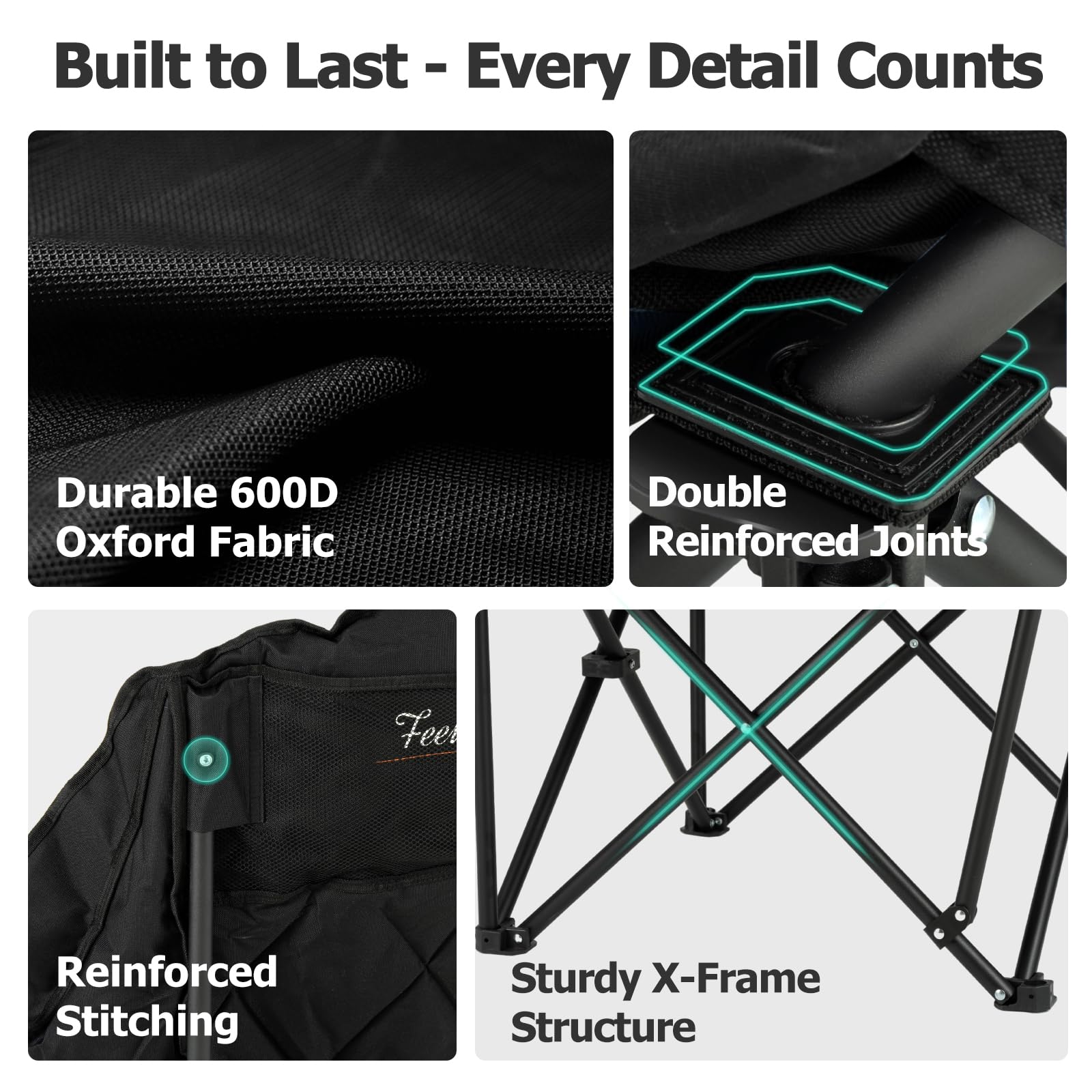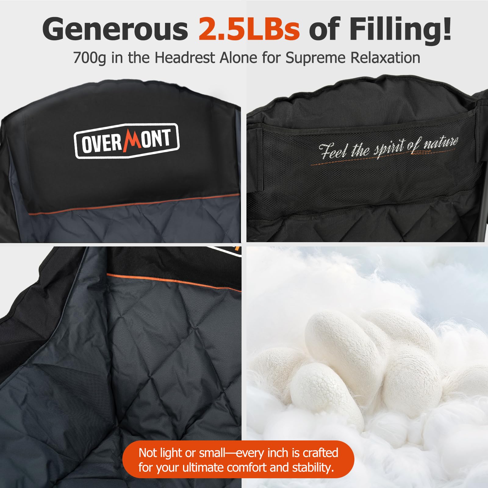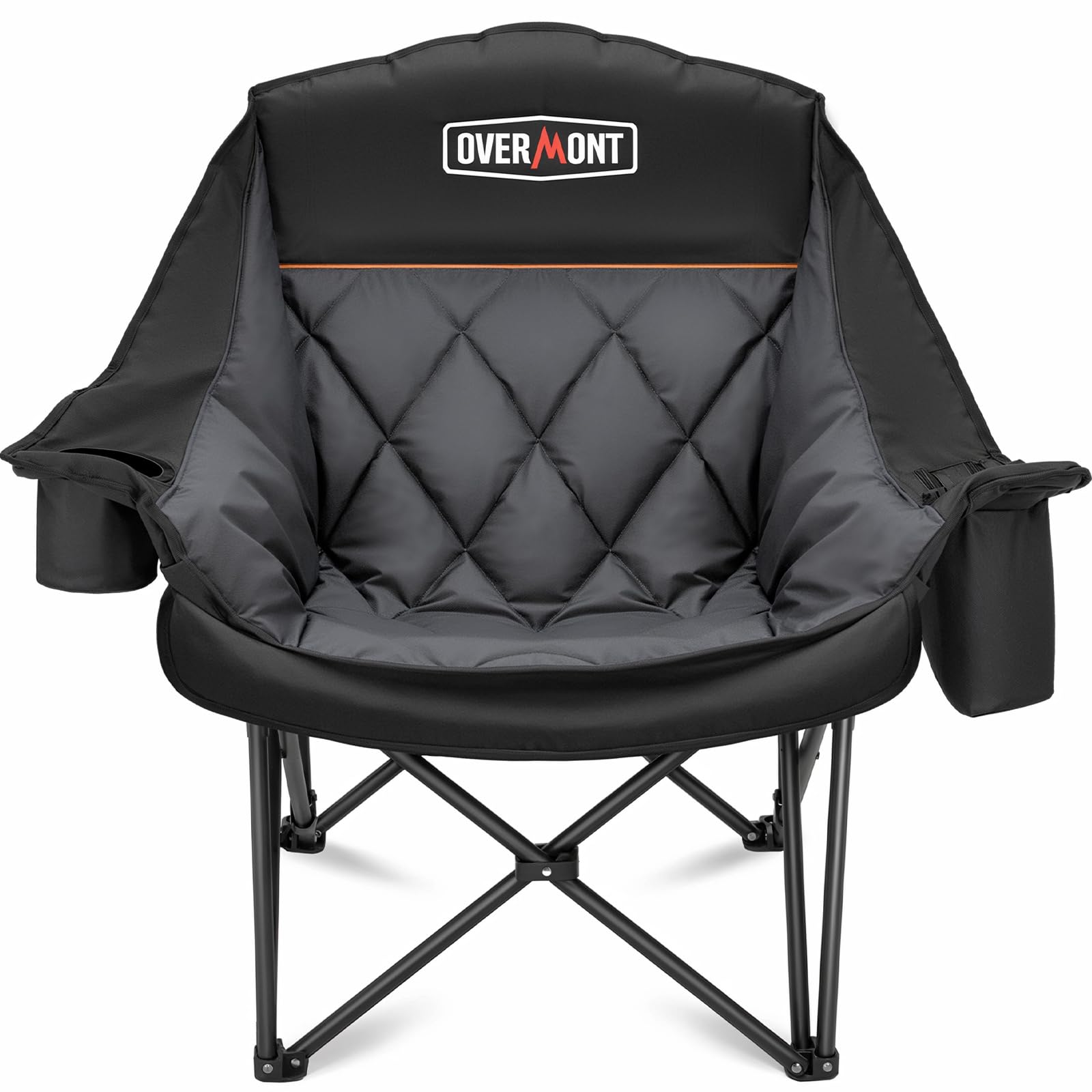 Overmont Oversized XL Camping Chair for Adults - 450lbs Support Heavy-Duty Padded Folding Chair with Side Pocket Cup Holder Cooling Bag for Outdoor Sports Garden Beach Fishing Lawn Black