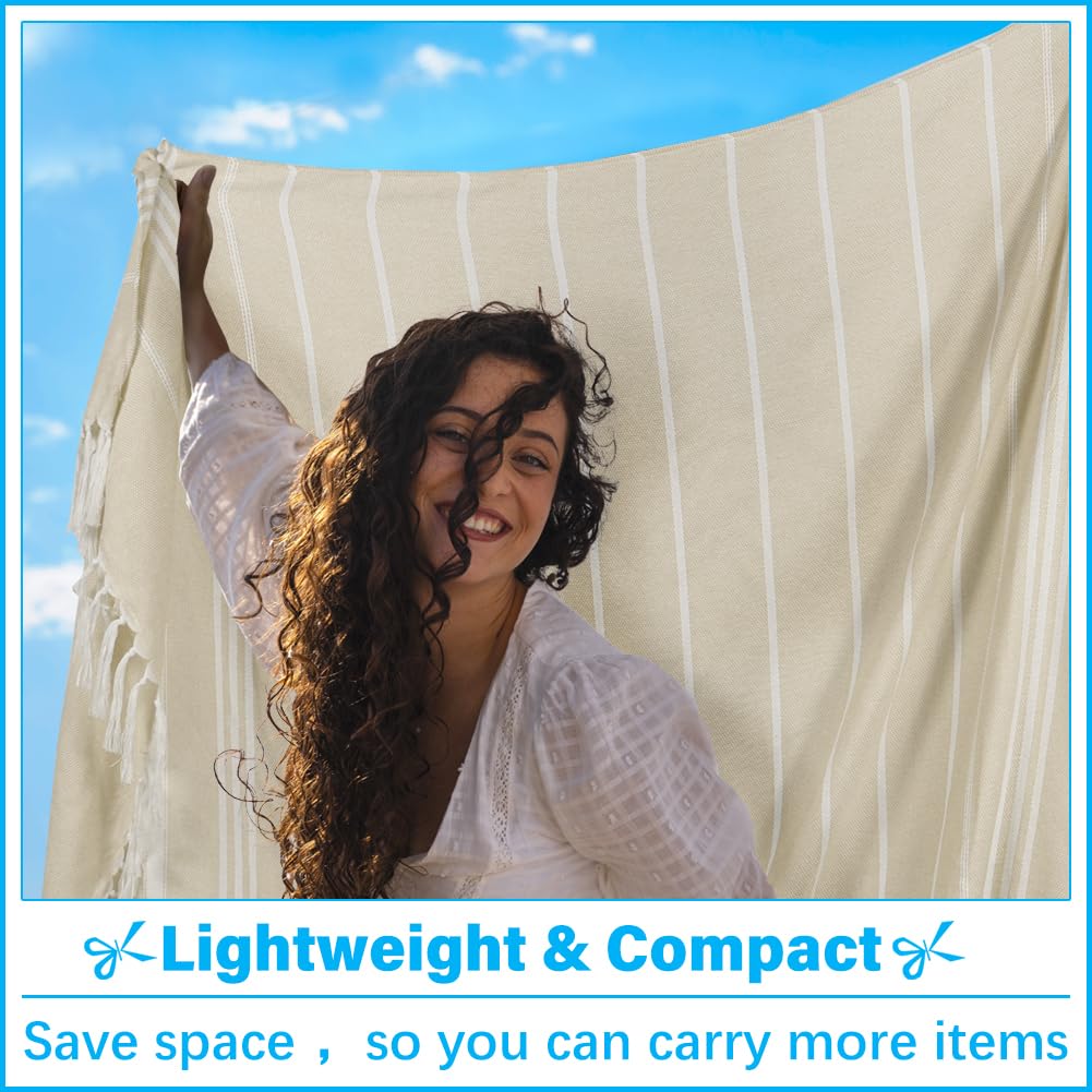 • SAND FREE:Featuring advanced sand resistant fabric,this turkish beach towel blanket prevents sand from sticking to its surface,making it easy to clean just shake it off with a quick flick.Enjoy a cleaner,more pleasant beach outing without the annoyance of sand clinging to your towel