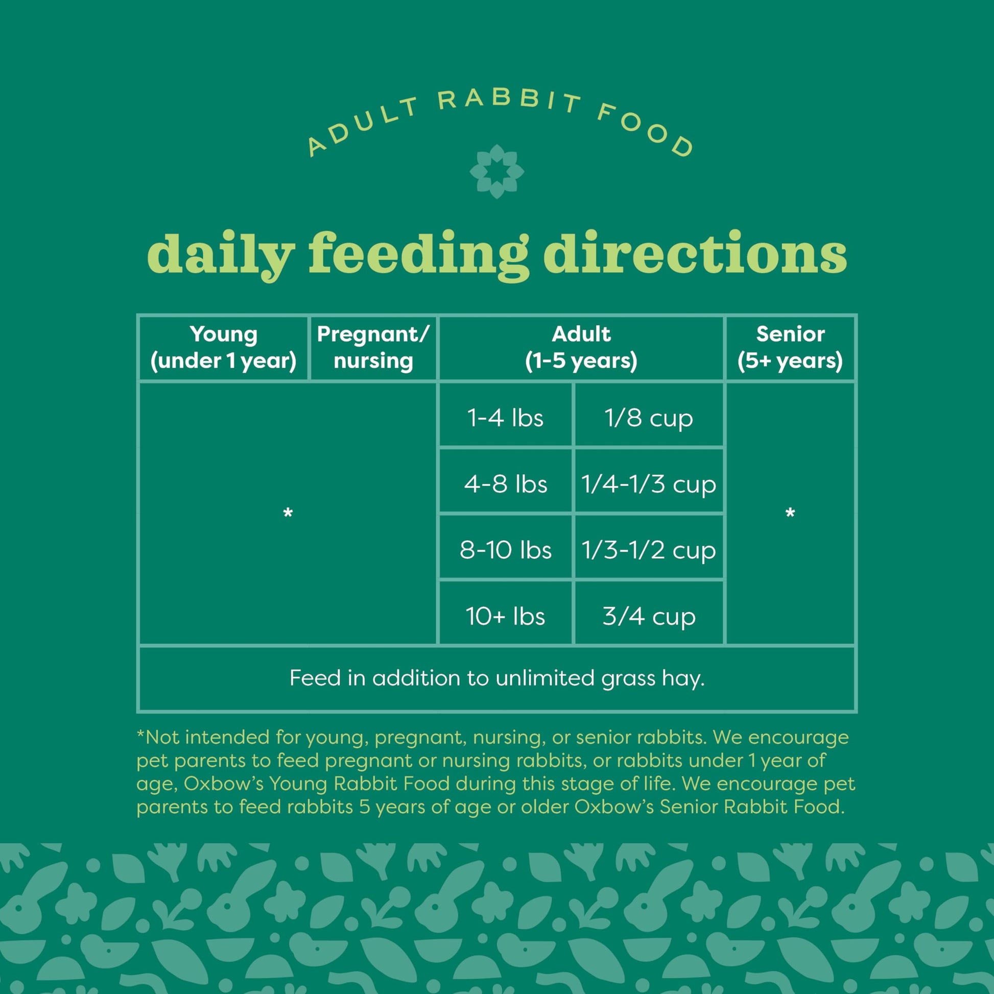 Details: At Oxbow Animal Health, our purpose is to help people and pets live happy, healthy lives. For more than 30 years, we’ve partnered with leading veterinarians and nutritionists to develop nutrition and care products that meet the specific species and life stage needs of rabbits, guinea pigs, chinchillas, hamsters, gerbils, rats, and mice. From farm fresh hays and nourishing fortified foods to wholesome treats, beneficial supplements, enrichment and care, Oxbow products are used and recommended by leading veterinary professionals and passionate pet parents worldwide. Oxbow’s Essentials - Adult Rabbit Food is formulated to meet the specific nutritional needs of adult rabbits and help them thrive. Uniform rabbit pellets prevent unhealthy selecting eating tendencies commonly found with mix-based diets. This complete and balanced adult rabbit food contains Timothy hay for healthy digestion and all the wholesome ingredients and vital nutrients needed to support daily function and performance. FEEDING INSTRUCTIONS: Mature Rabbits (over 1 year) 1-4 lbs = 1/8 cup daily 4-8 lbs = 1/4-1/3 cup daily 8-10 lbs = 1/3-1/2 cup daily 10 lbs+ = 3/4 cup daily Feed in addition to unlimited grass hay. Oxbow Essentials - Adult Rabbit Food is not intended for growing, gestating or lactating animals. Feed Oxbow Essentials - Young Rabbit Food to rabbits requiring a higher level of nutrition. Please note that these are guidelines.