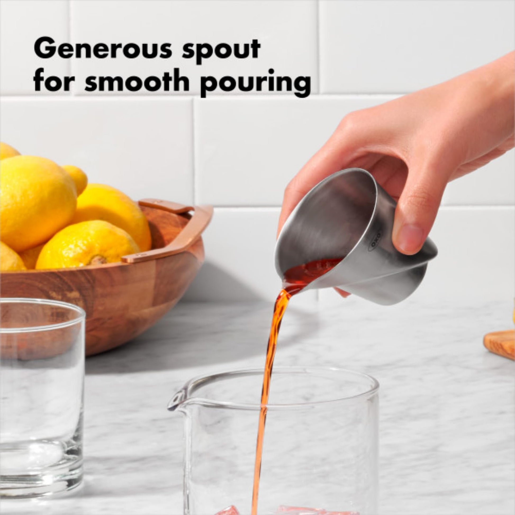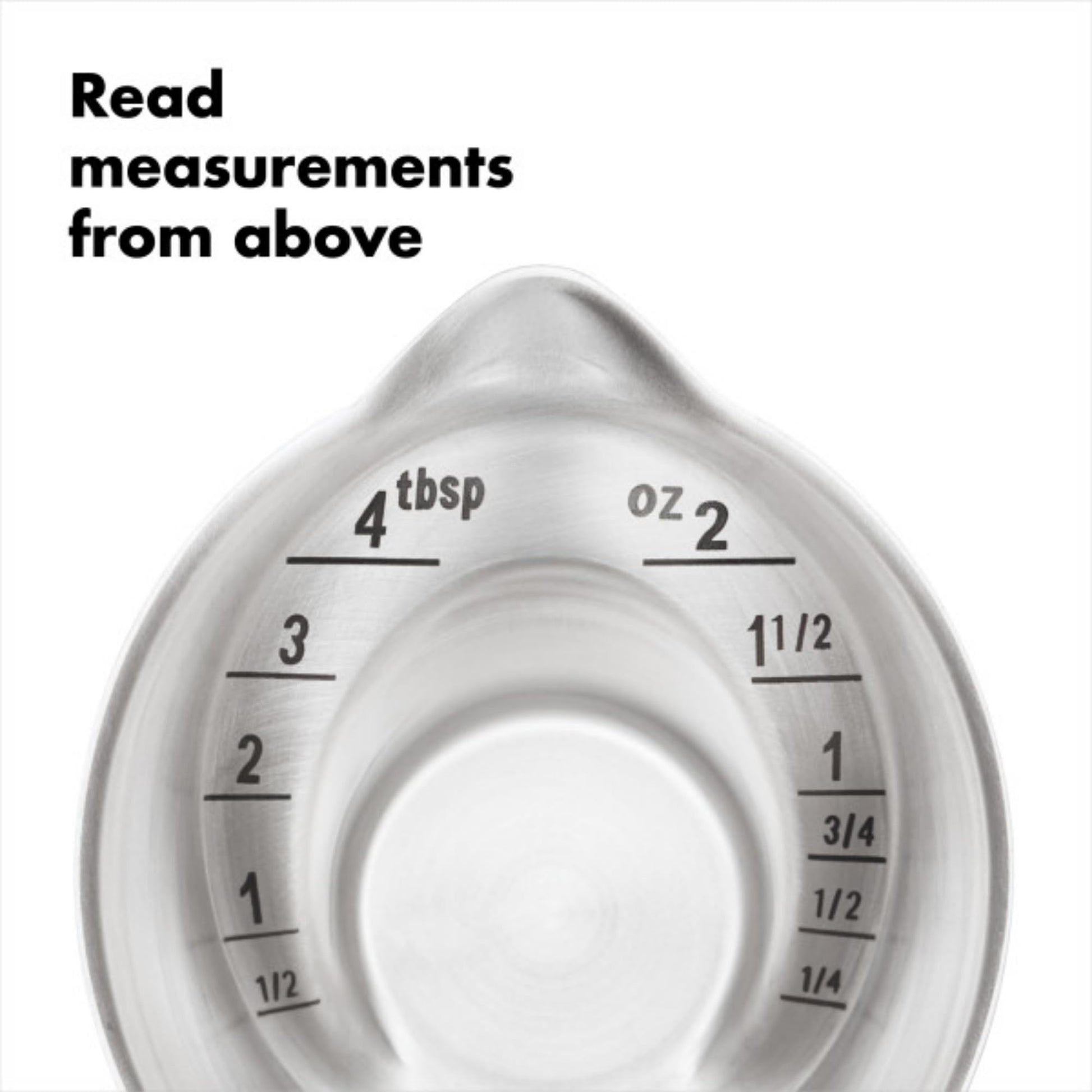 Details: The OXO good grips mini angled measuring cup is now available in durable stainless steel. These revolutionary Cups feature a patented angled surface that lets you read measurement markings by looking straight down into the cup and eliminates the need to fill, check and adjust the amount of liquid you are measuring. The mini cup features Ounce and tablespoon markings for measuring small amounts of liquid ingredients like vanilla extract, lemon juice, or soy sauce. Try the mini cup at the bar for mixing drinks too. And keep a spare on hand for non-food uses like measuring laundry detergent, plant food and more. Dishwasher safe.