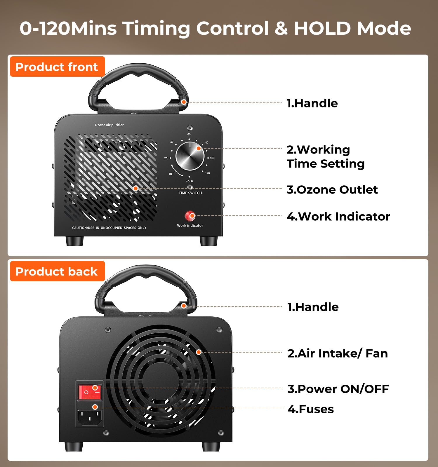 • If you turn the knob from 'OFF' to 'HOLD'. Machine will continuously release ozone until you manually turned off ใ€EASY TO USEใ€‘Just turn the timing knob of the air ozone machine to set the ozone generation time and leave the room. If you turn the knob from 'OFF' to 'HOLD'. The Machine will continuously release ozone until you manually turned off. It will be more effective to remove the odor source before using the machine
