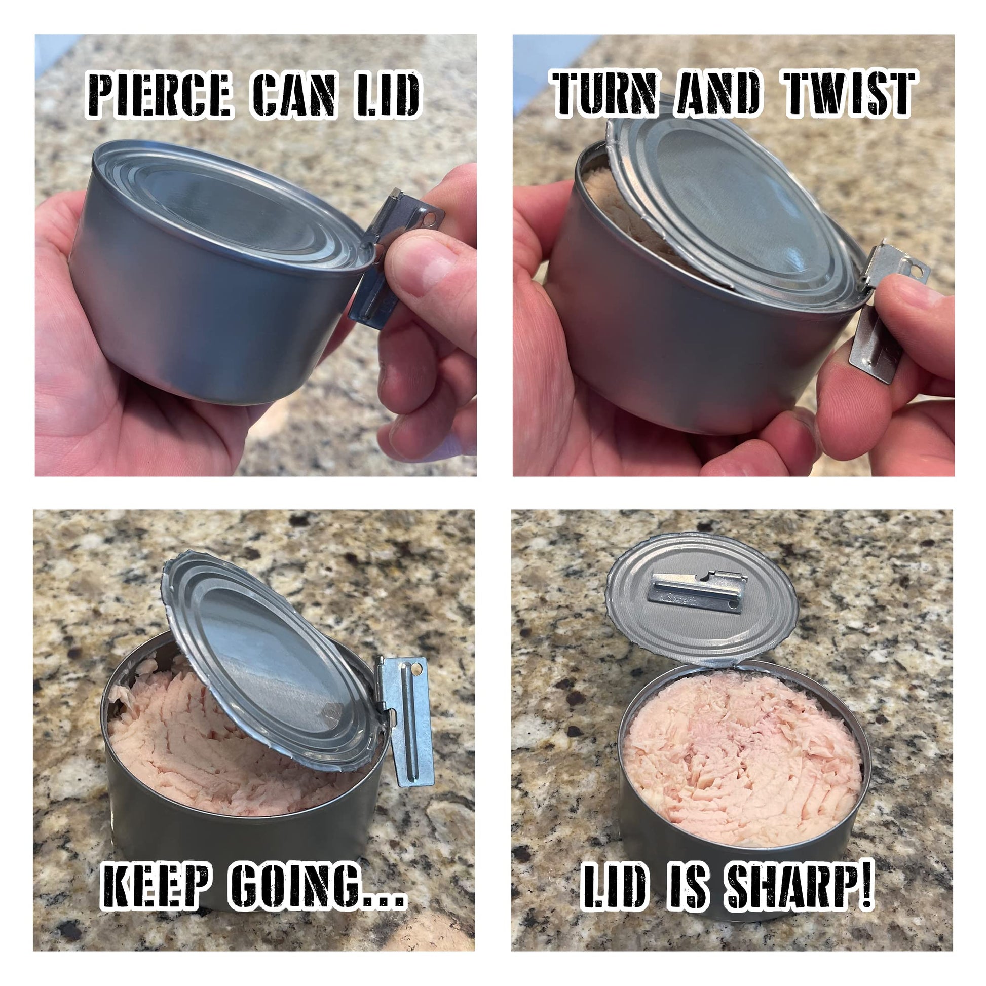 • HOW TO USE THE CAN OPENERS - 1. Open blade 2. Place the notch of the can opener on the rim of the can with the blade inside the rim 3. Twist the blade down so that it punctures the lid of the can 4. Repeat twisting while turning the can 5. Be careful removing the lid. The lid will be sharp