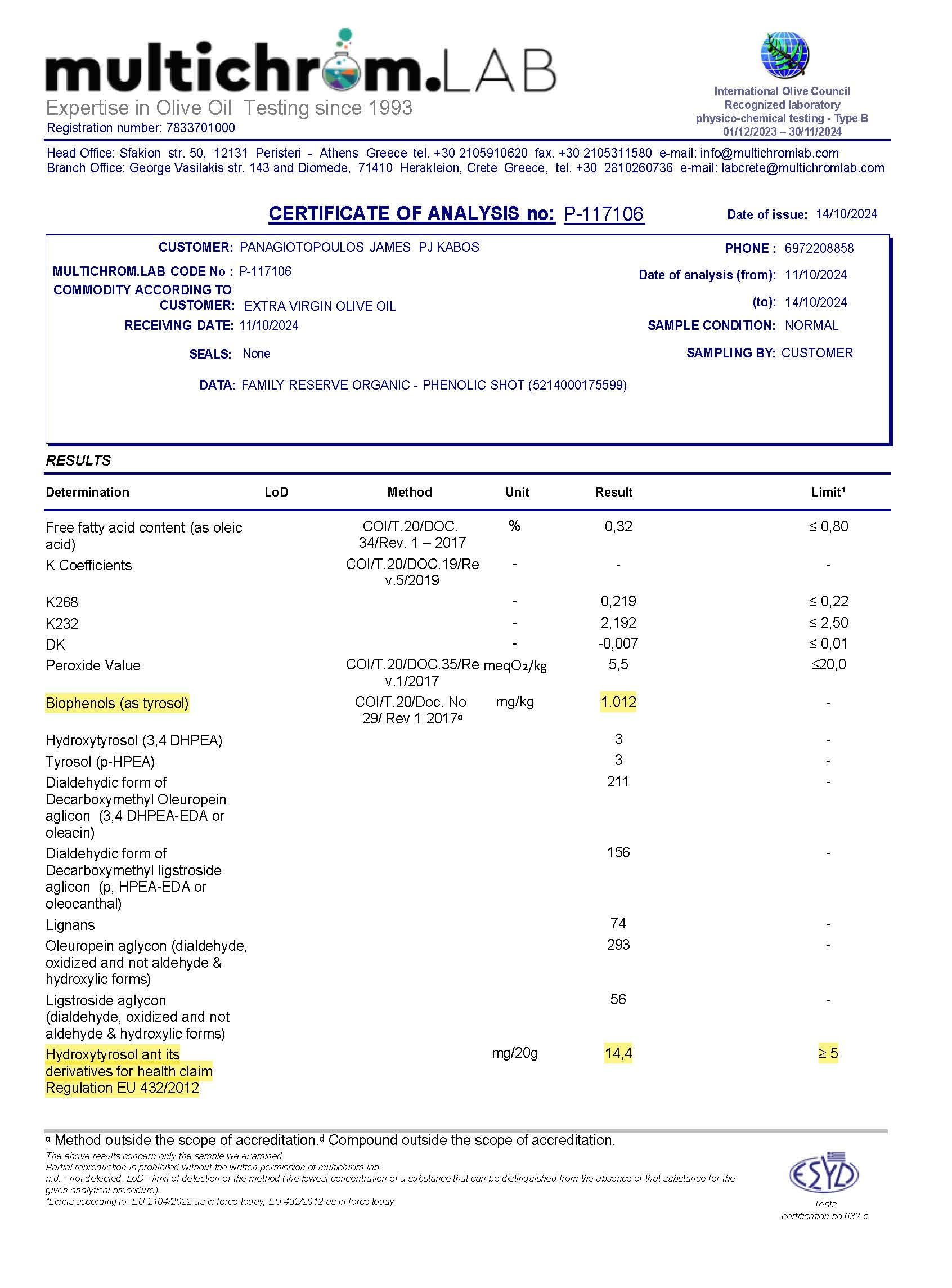 • HEALTH CLAIM (Regulation EU 432/2012): Hydroxytyrosol and Derivatives content of 14.4 mg/20gr (HPLC) and 32.18 mg/20gr (NMR). Tested during production using both the HPLC and NMR chemical testing methods.