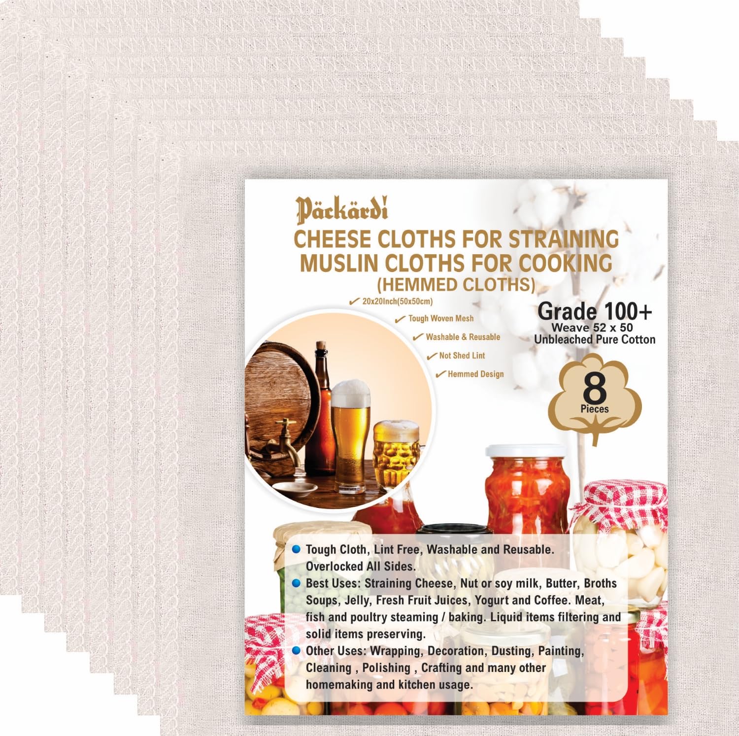 PACKARDI 8 PCS Grade 100+ Cheese Cloths 20x20 Inch, Reusable and Washable Cheesecloths for Straining,100% Unbleached Pure Cotton Lint Free, Ultra-Fine Cheese Cloth for Baking & Juicing (52×50 TPI)