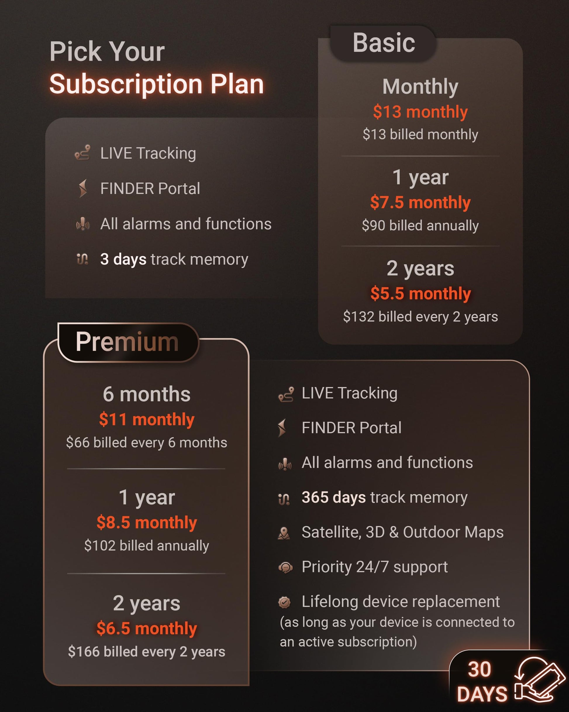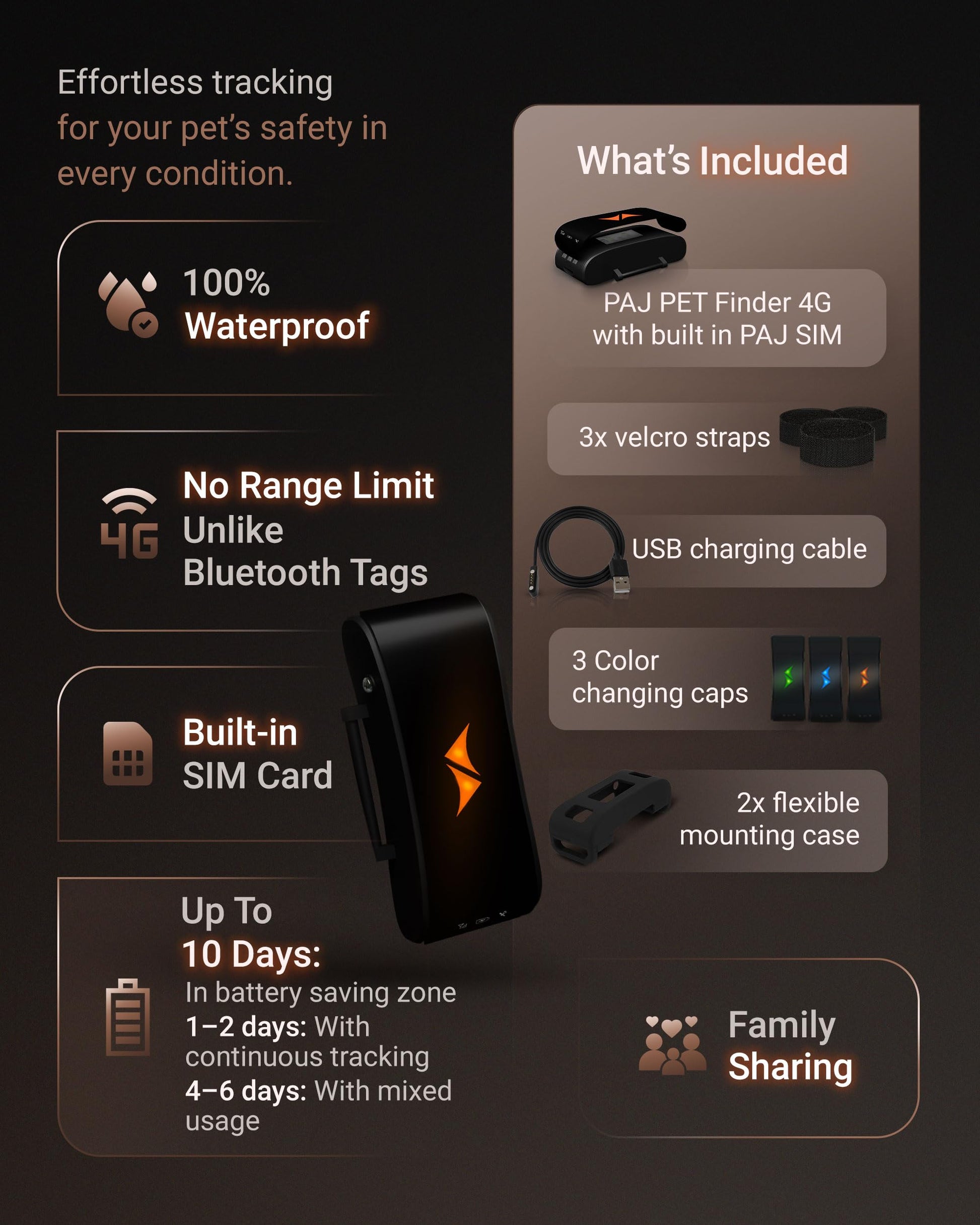 • FLEXIBLE SUBSCRIPTION PLANS — Enjoy flexible and affordable service plans with the PAJ GPS Tracker. Choose between Basic and Premium options, with low monthly fees. The built-in SIM card ensures seamless, reliable connectivity, while 24/7 multilingual support lets you track your pet confidently—whether you're at home or traveling.