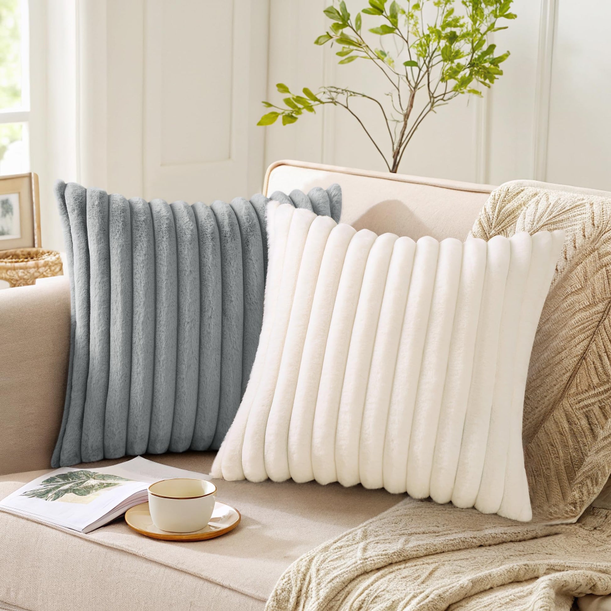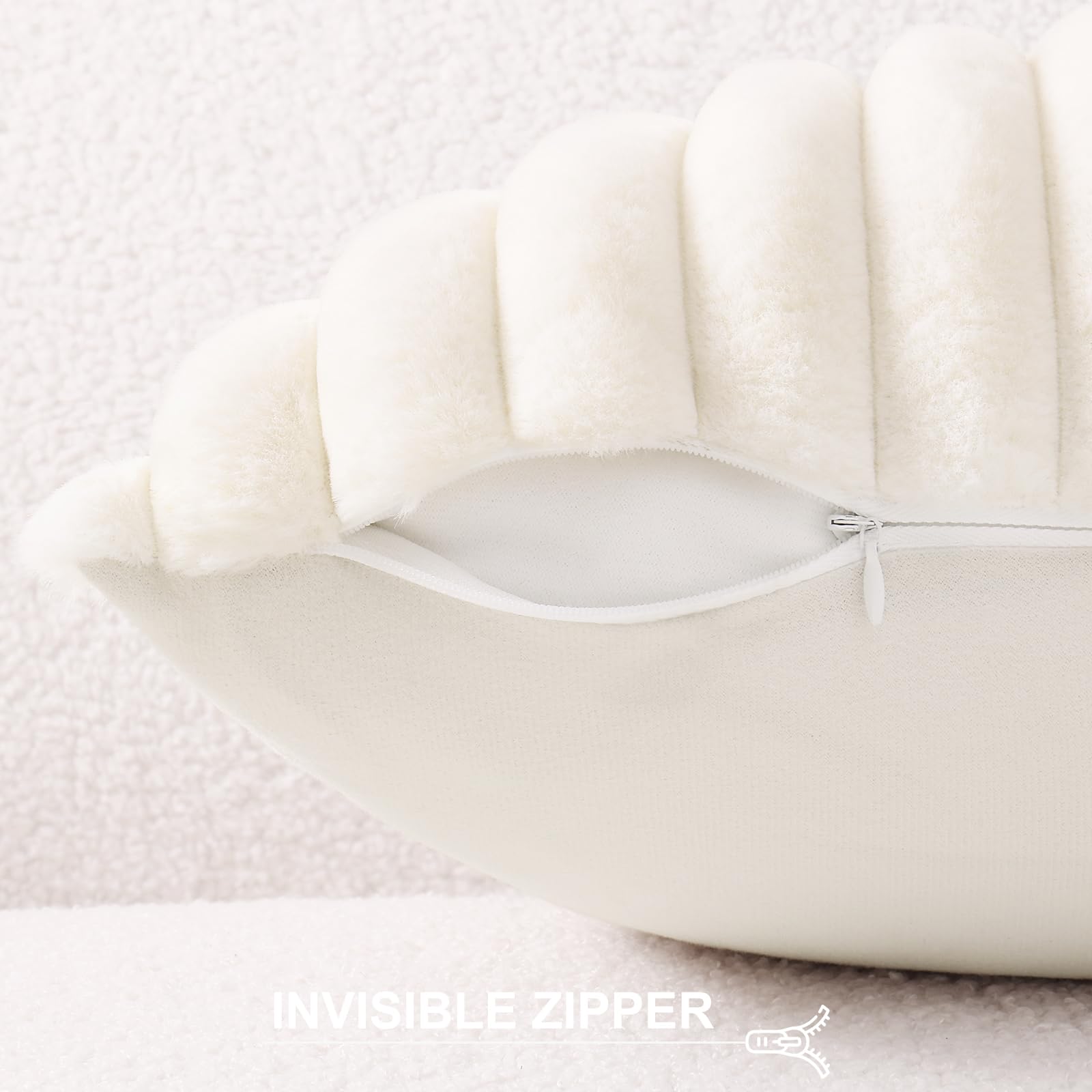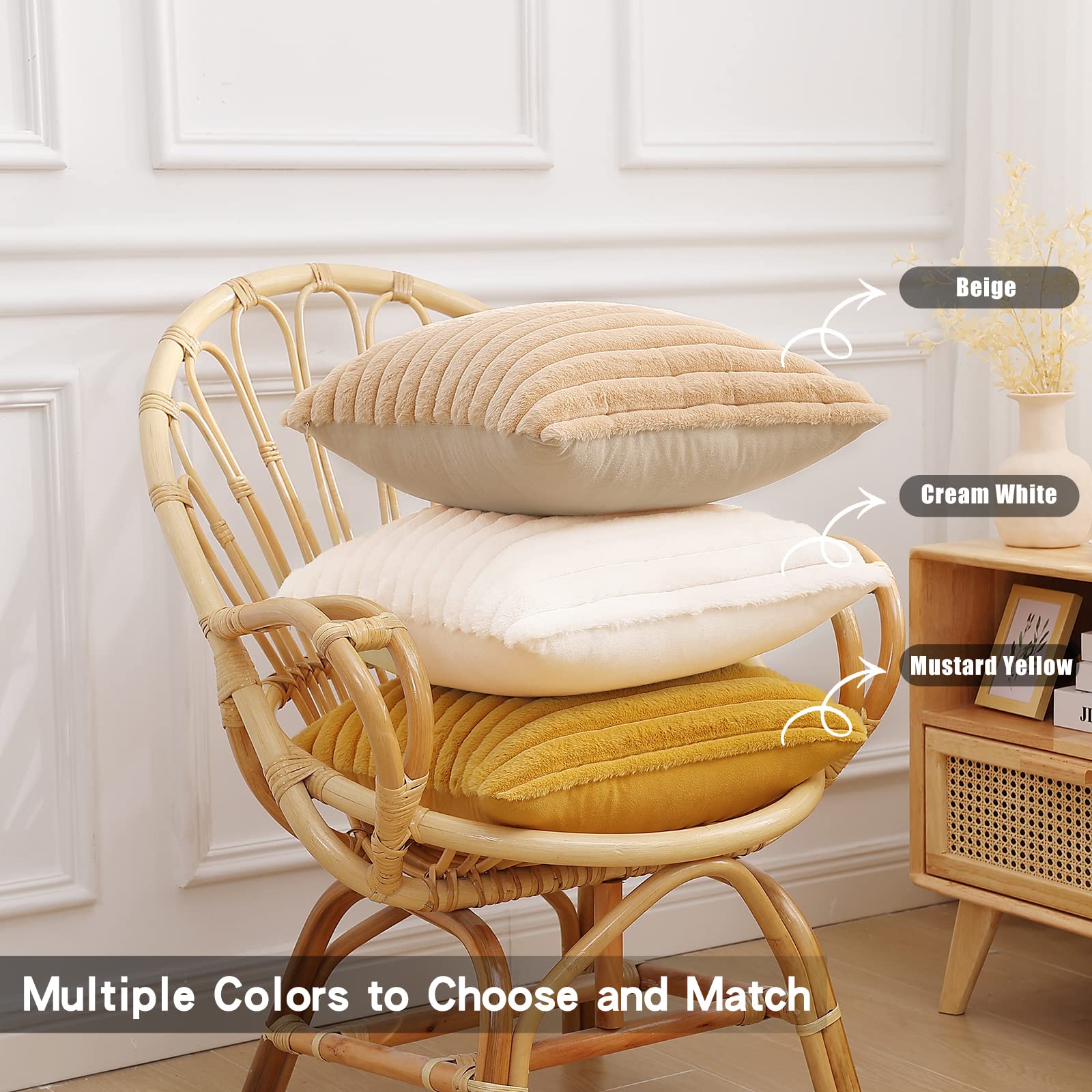 Pallene Faux Fur Plush Fall Throw Pillow Covers 18x18 Set of 2, Luxury Soft Fluffy Striped Decorative Pillow Covers for Sofa, Couch, Living Room, Cream White